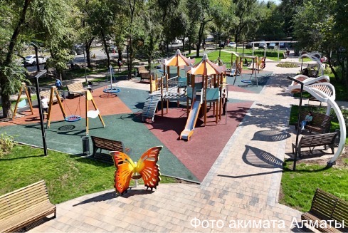 Рядом, чуть выше по улице, ближе к ул. Толе би, находится еще один сквер – он не обновлялся почти десять лет, с 2016 года. По многочисленным обращениям жителей в этом году акимат начинает его обновление в рамках текущего ремонта.