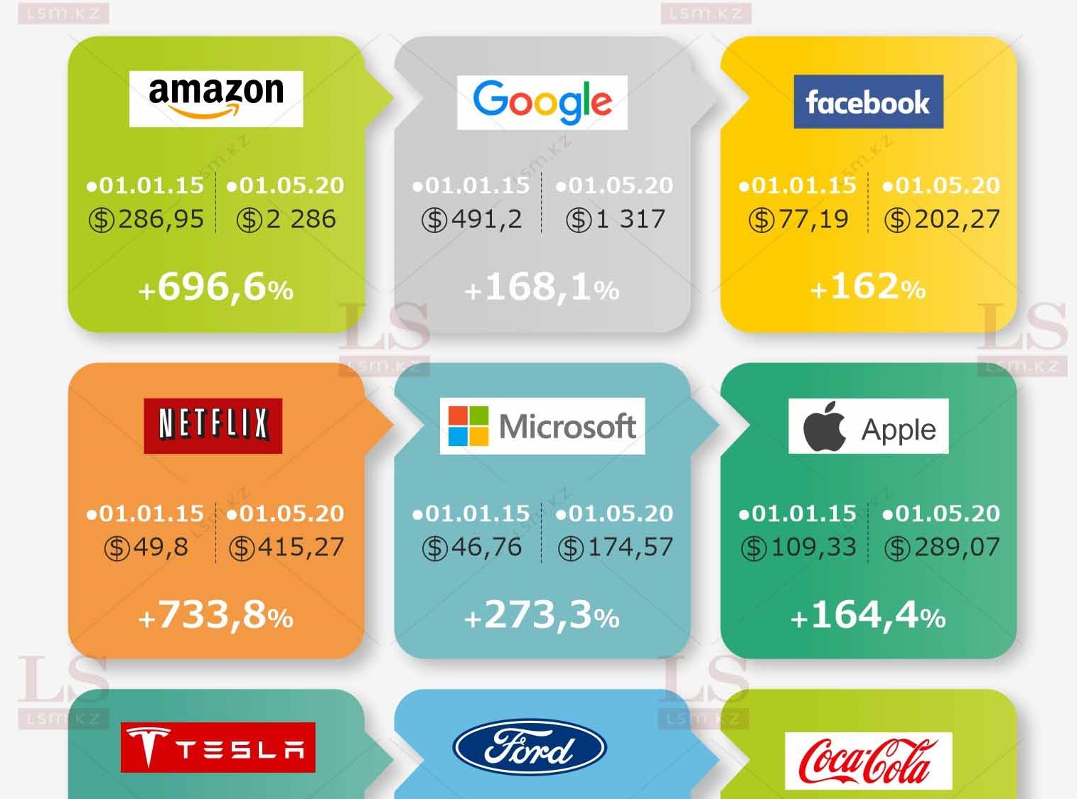 LS решил показать, как изменились котировки некоторых известных зарубежных компаний с 2015 года. А также подсчитал, сколько заработали бы инвесторы, если бы они вложились в эти акции пять лет назад.