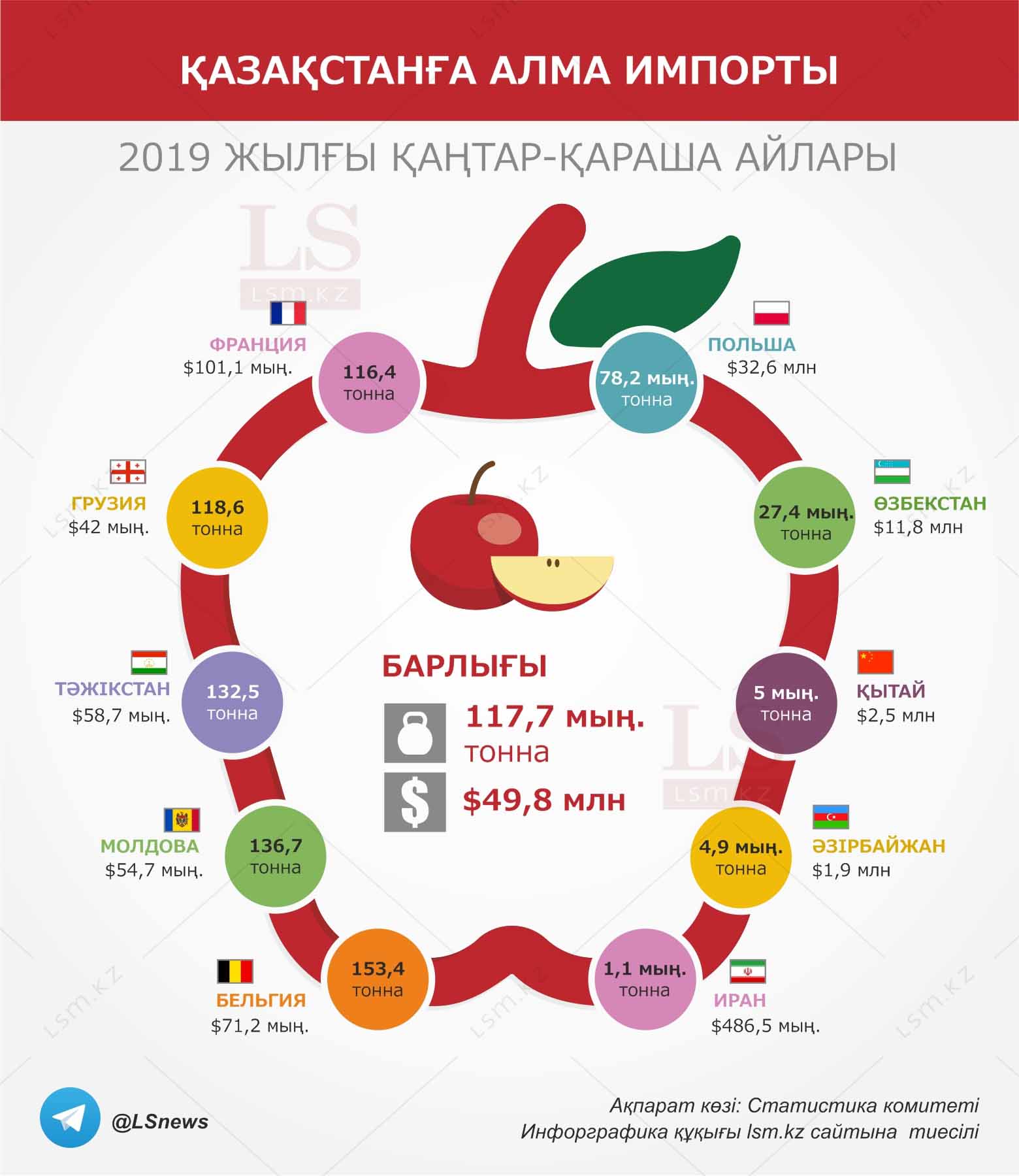 Ең үлкен көлем Польшадан келді. Бұл ел Қазақстанға $32,6 млн.теңгеге 78,2 мың тонна алма, екінші орында- Өзбекстан. Оңтүстіктегі көрші ел $11,8 млн.-ға 27,4 мың тонна жеміс берді. Үшінші орын- Қытайда, бұл ел 11 айда $2,5 млн-ға 5 мың тонна алма сатқан.