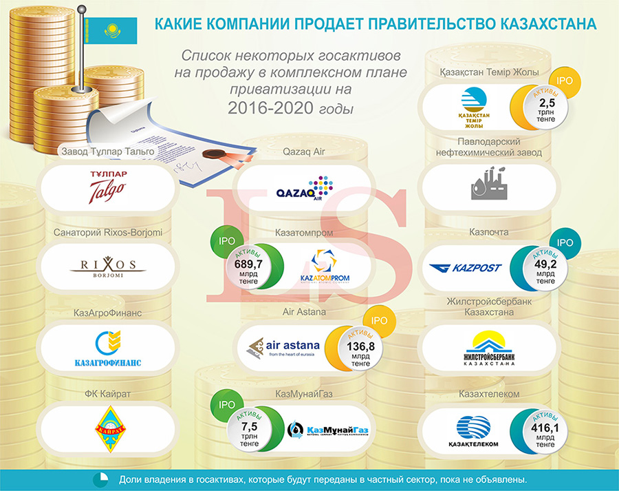 Напомним, в Казахстане проходит вторая волна приватизации. На 10 ноября 2015 года уже продано 217 объектов общей стоимостью 70,76 млрд тенге.