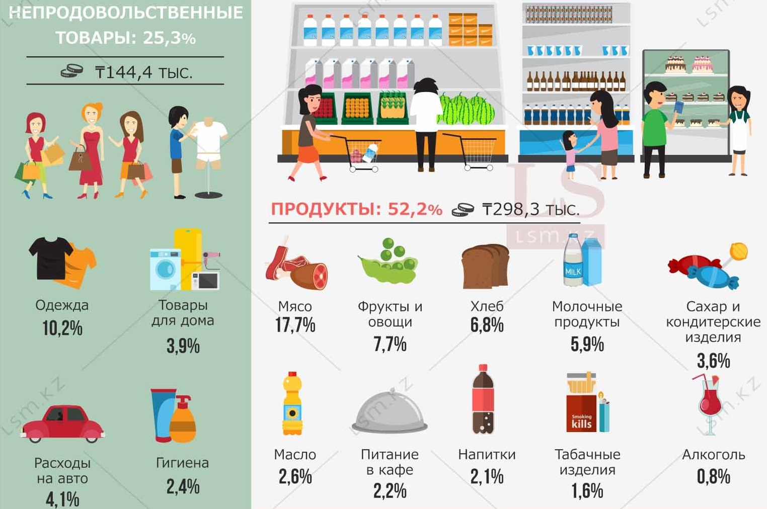 Из них 52,2% (298,3 тыс. тенге) приходится на продовольствие.