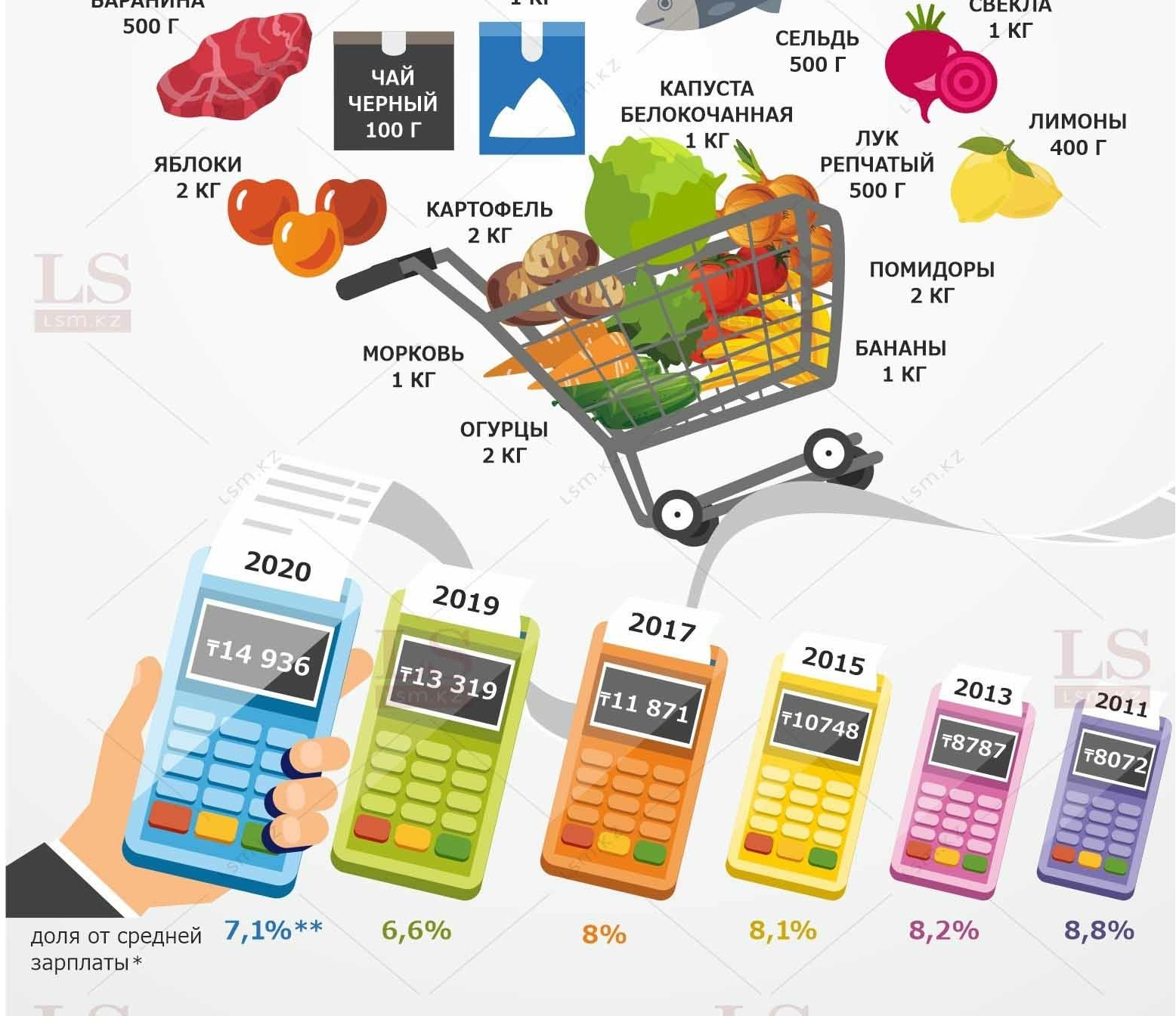 Согласно данным бюро национальной статистики, в ноябре 2011 года казахстанцы тратили на условную продовольственную корзину почти 8,1 тыс. тенге, что составляло 8,8% от просчитанной тогда средней зарплаты.
