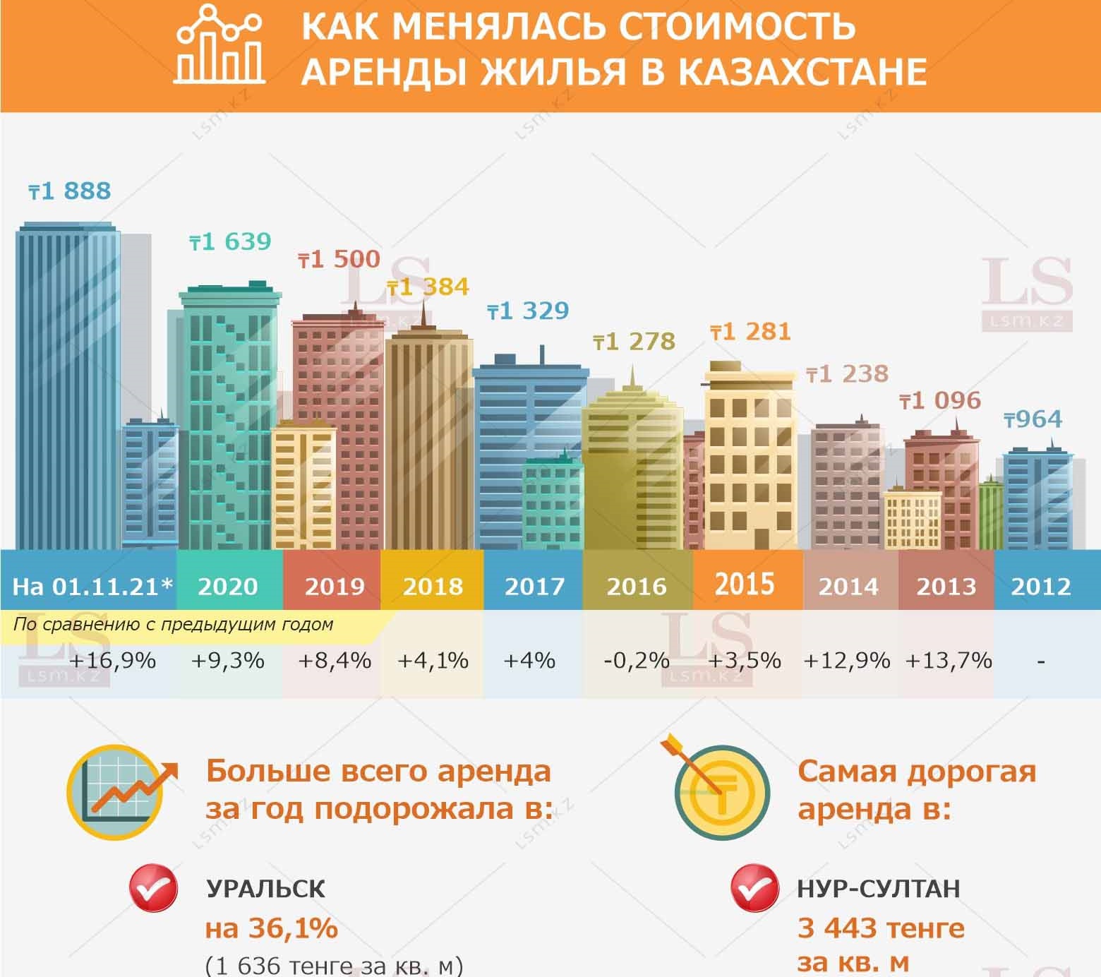 Почти вдвое подорожала аренда жилья в Казахстане за 10 лет. LS показывает в инфографике, как менялась стоимость проживания.