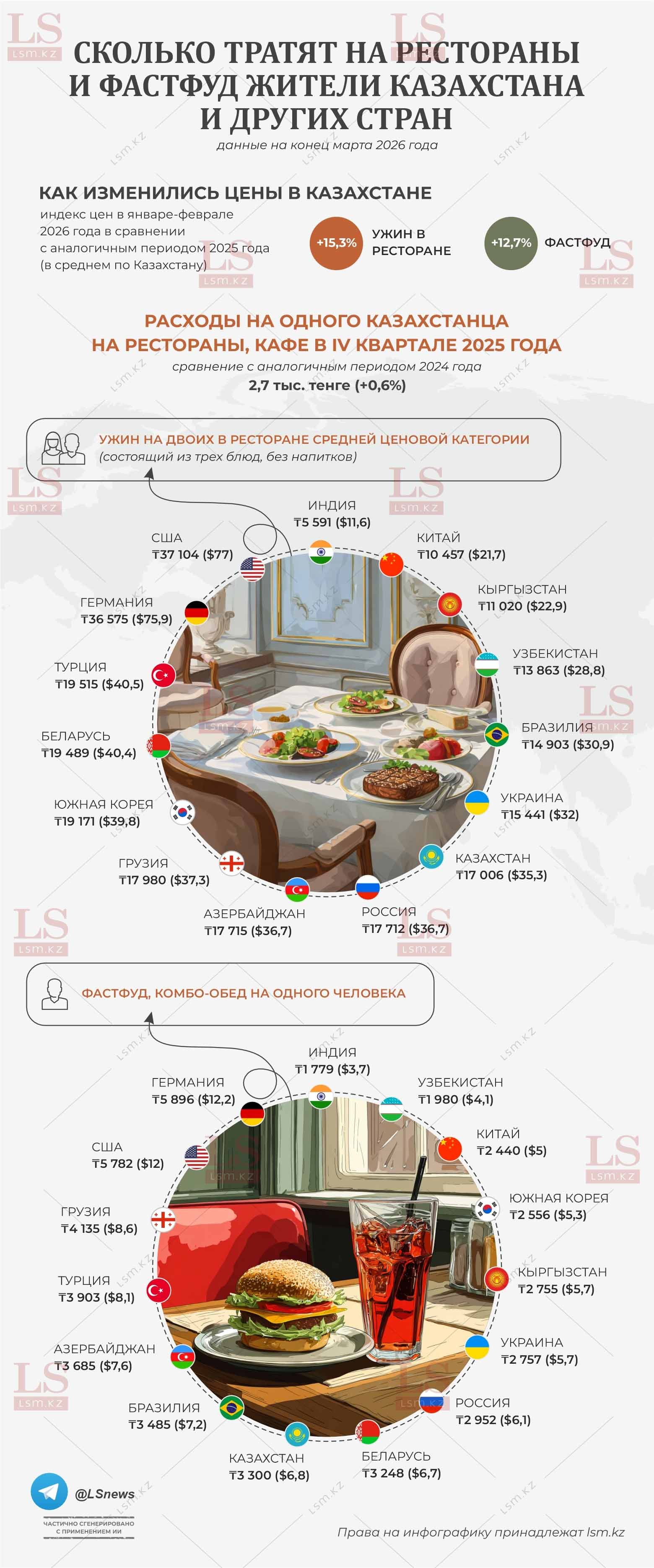 Ужин на двоих в ресторане средней ценовой категории обходится казахстанцам в среднем в 17 тыс. тенге. Это дороже, чем в Китае (10,5 тыс. тенге), Кыргызстане (11 тыс. тенге) и Узбекистане (13,9 тыс. тенге), но примерно на уровне России (17,7 тыс. тенге) и Азербайджана (17,7 тыс. тенге).
