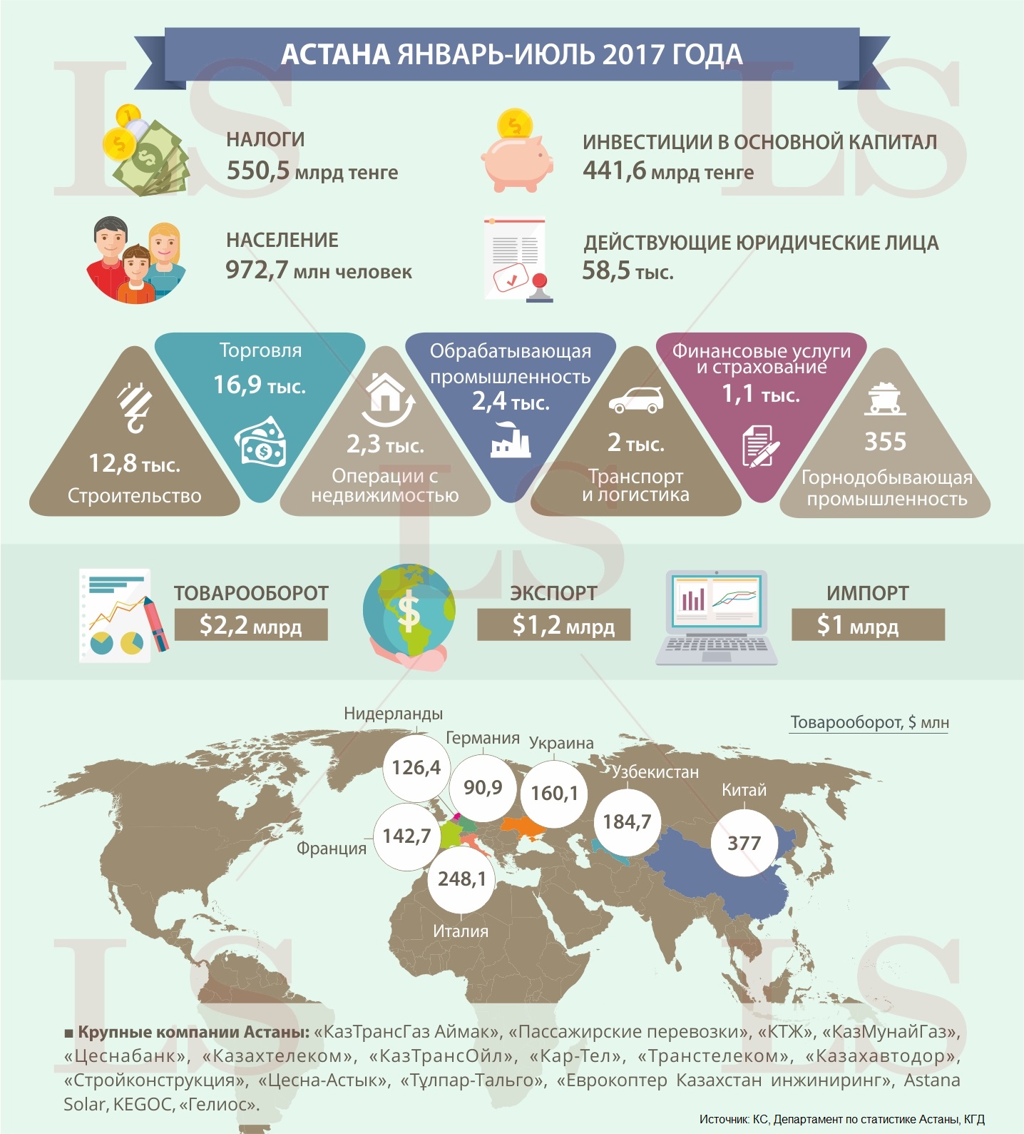 В январе-июле 2017 года предприятия Астаны выплатили в госбюджет 550,5 млрд тенге в виде налогов и платежей. Инвестиции в основной капитал городских компаний достигли 441,6 млрд тенге. По данным последней переписи населения, в столице проживает 972,7 тыс. человек.