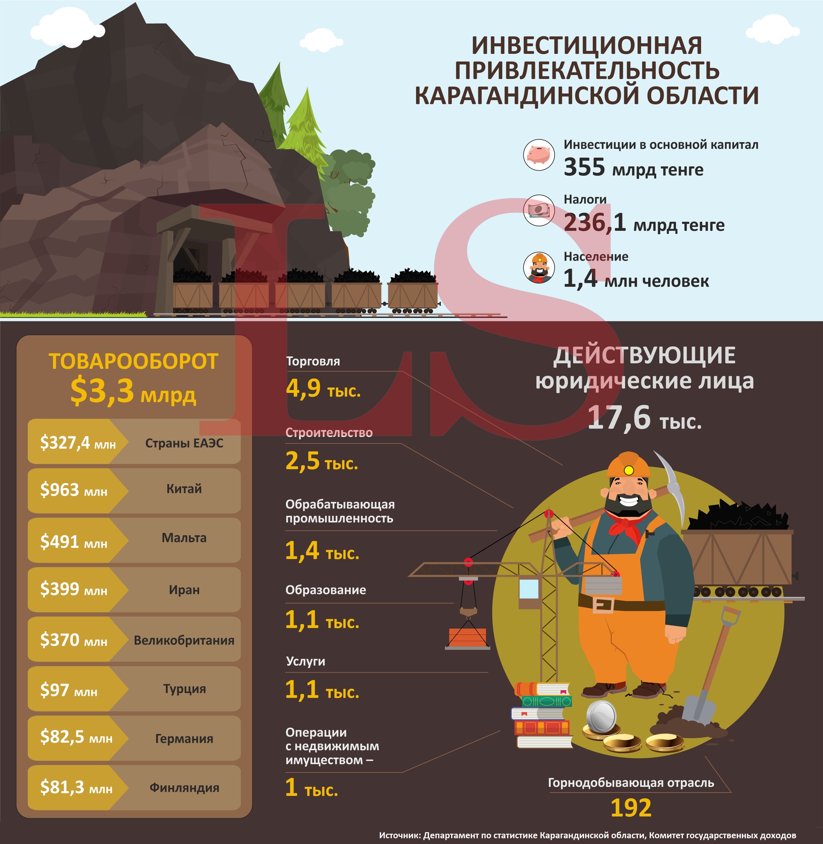 LS начинает публиковать цикл инфографик по областям Казахстана, в которых будут рассмотрены структура товарооборота, объем привлеченных инвестиций и количество действующих компаний. В первой инфографике будет рассмотрена Карагандинскую область.