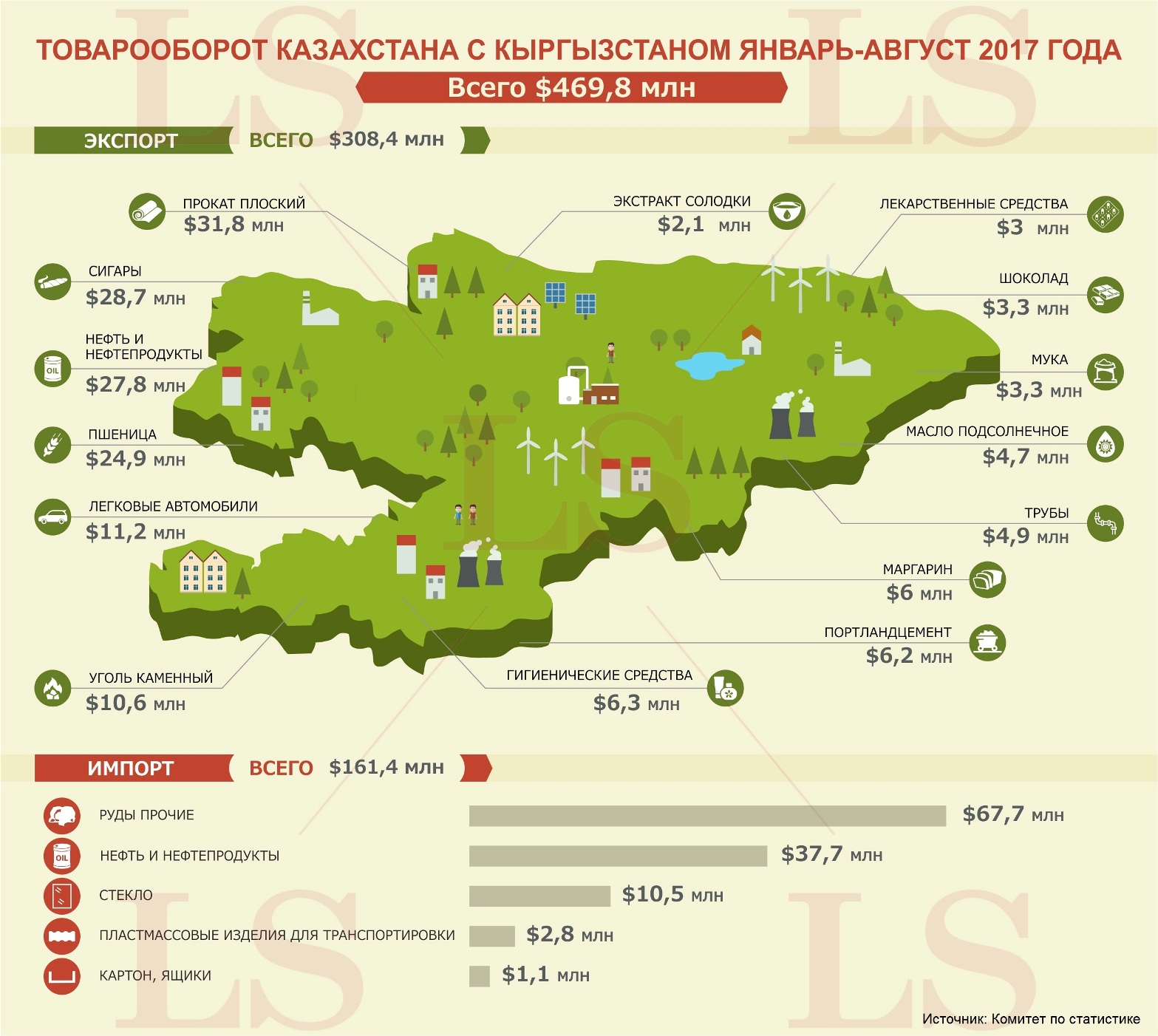 Товарооборот Казахстана с Кыргызстаном в январе-августе 2017 года достиг $470 млн, передает LS.