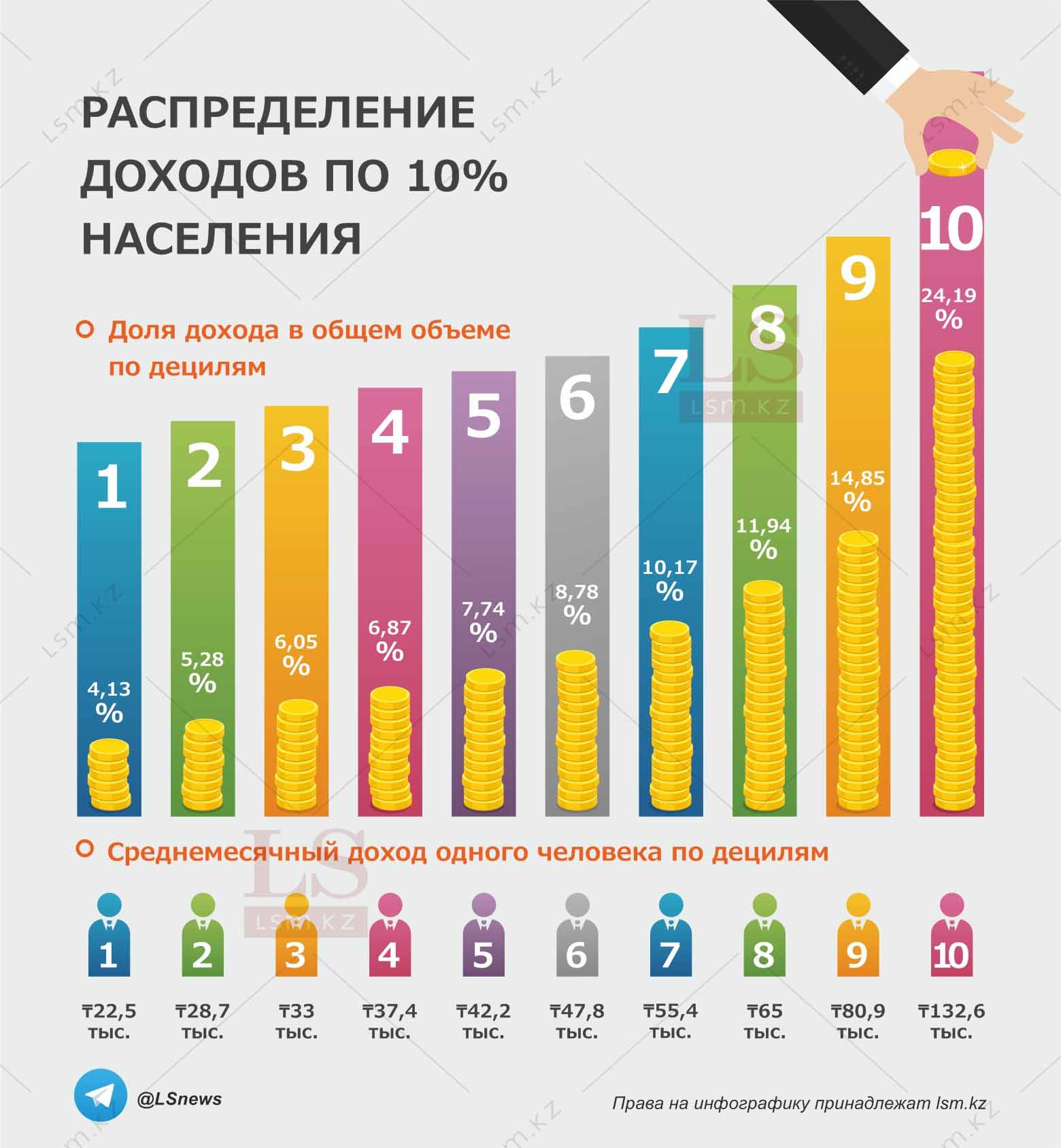 Половина наименее обеспеченного населения страны (первые пять дециль) получают лишь 30% общего объема доходов. При этом в месяц на одного человека в пятой группе приходится 42,2 тыс. тенге.