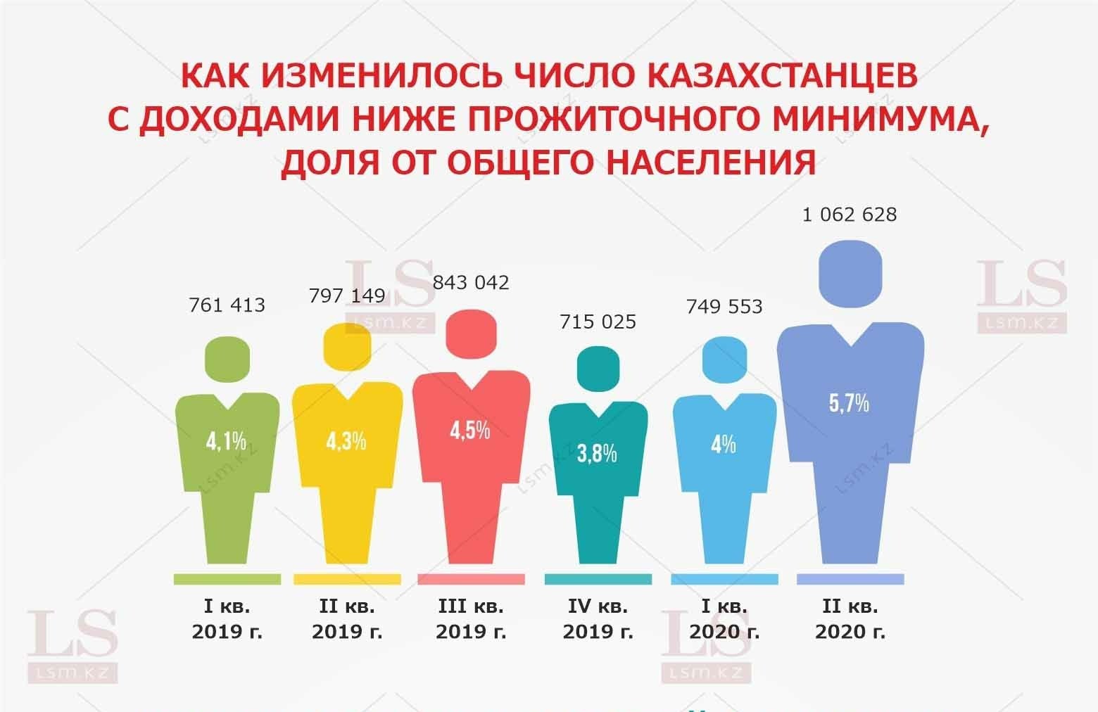 По итогам II квартала 2020 года в Казахстане более 1 млн человек имеют доход ниже величины прожиточного минимума (ВПМ), который составил 32 560 тенге в месяц.