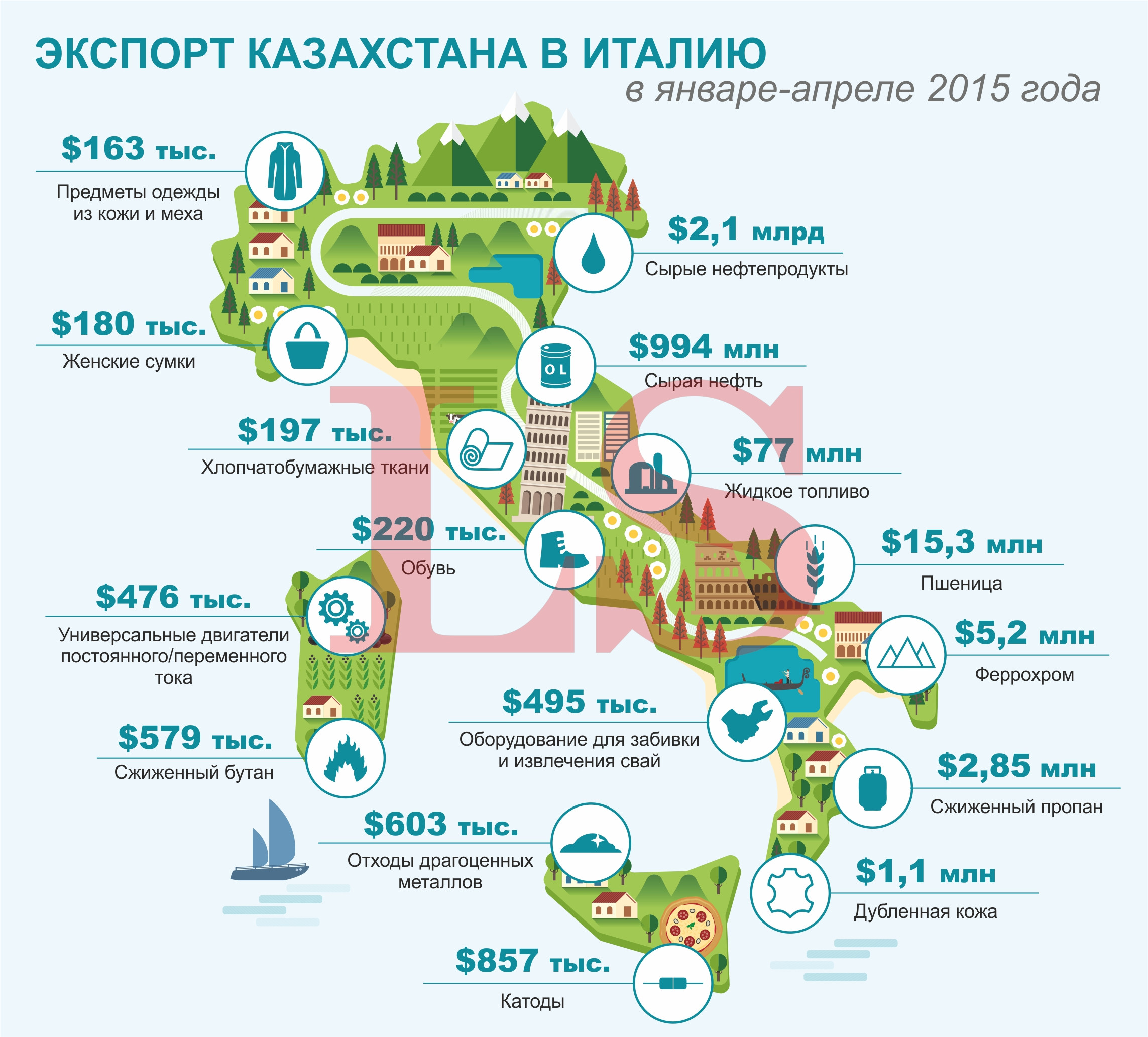 Помимо этого, Казахстан поставил в Италию в январе-апреле текущего года жидкое топливо на сумму $77 млн. Также Италия приобрела пшеницу на $15,3 млн. В то же время сумма приобретенного Италией феррохрома достигла $5,2 млн. Кроме того, в Италию вывозятся сжиженные пропан и бутан, промышленное оборудование, дубленная кожа, ткани, женские сумки, обувь и так далее.