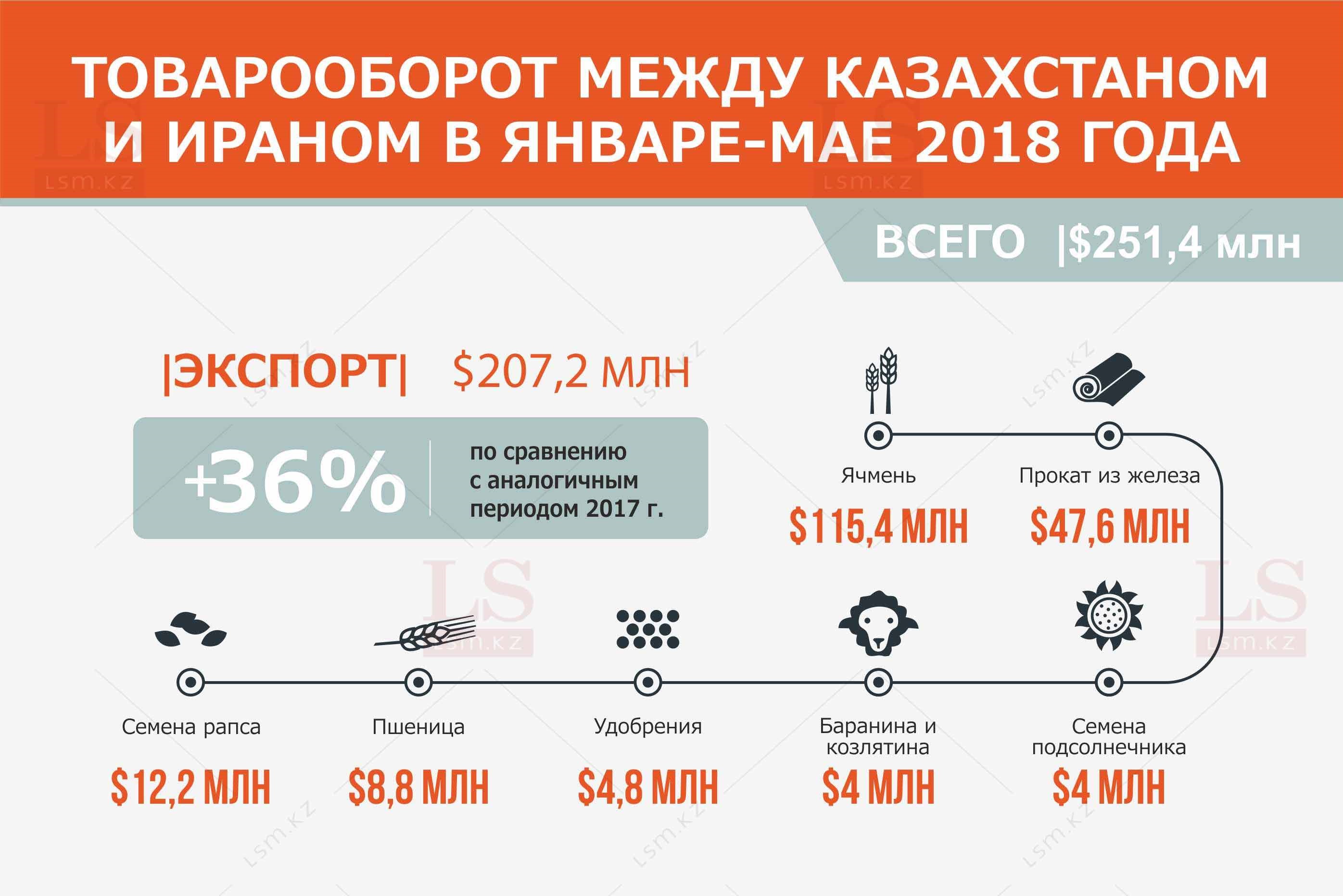 Товарооборот между Казахстаном и Ираном в январе-мае 2018 года составил более $250 млн. LS представляет инфографику о товарах, которые страны поставляют друг другу.
