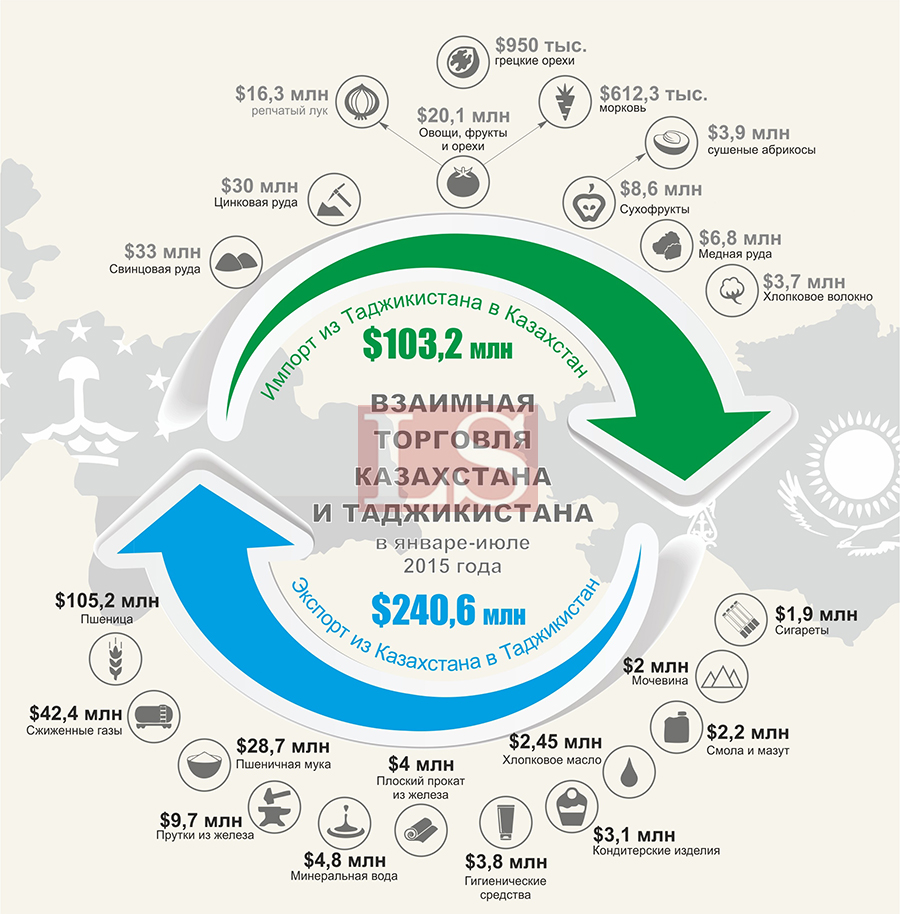 В свою очередь Таджикистан продает Казахстану руды металлов – свинца, цинка и меди. Поставки руды занимают более 67% импорта из Таджикистана.