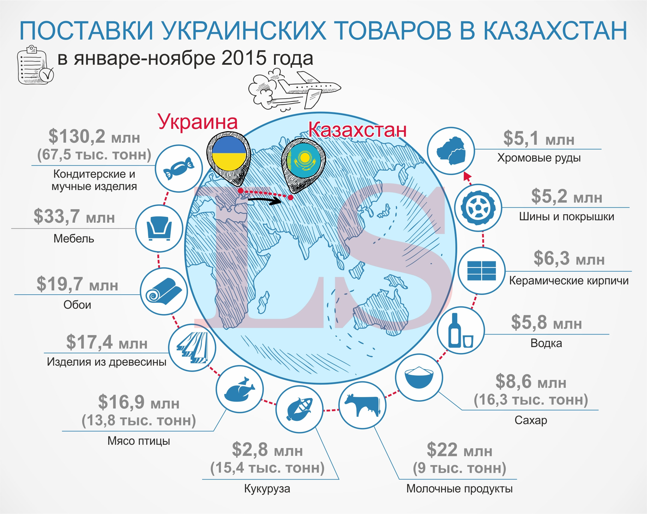 Также зафиксированы значительные поставки мебели, обоев, изделий из древесины, керамических кирпичей. Более того, в Казахстане спросом пользуются продовольственные товары из Украины – мясо птицы, кукуруза, сахар, молочные продукты и другие. Также Казахстан приобрел шины, покрышки и хромовые руды.