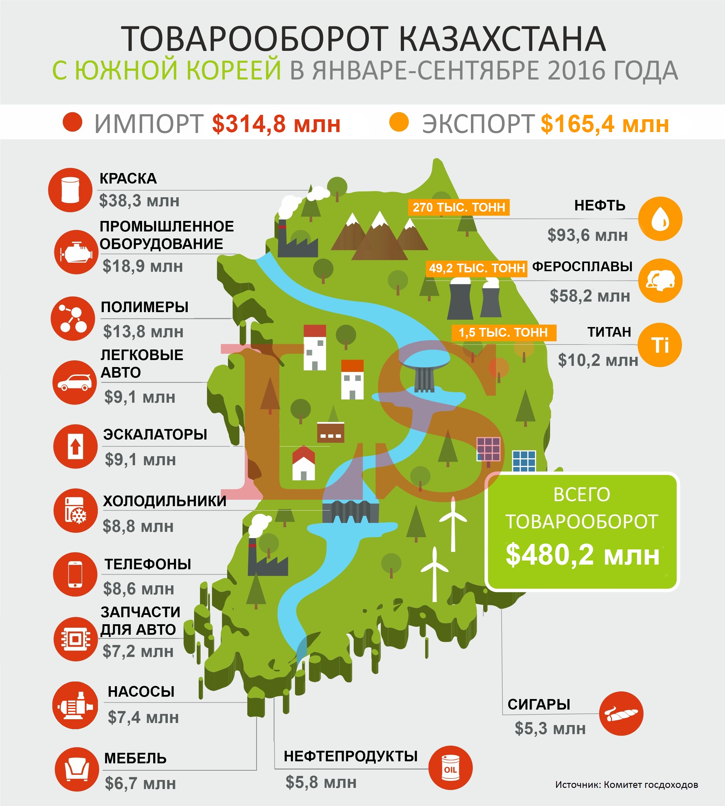Товарооборот Казахстана с Южной Кореей в январе-сентябре 2016 года составил $480,2 млн, что на 56,3% меньше, чем за девять месяцев 2015 года ($1,1 млрд), передает LS.