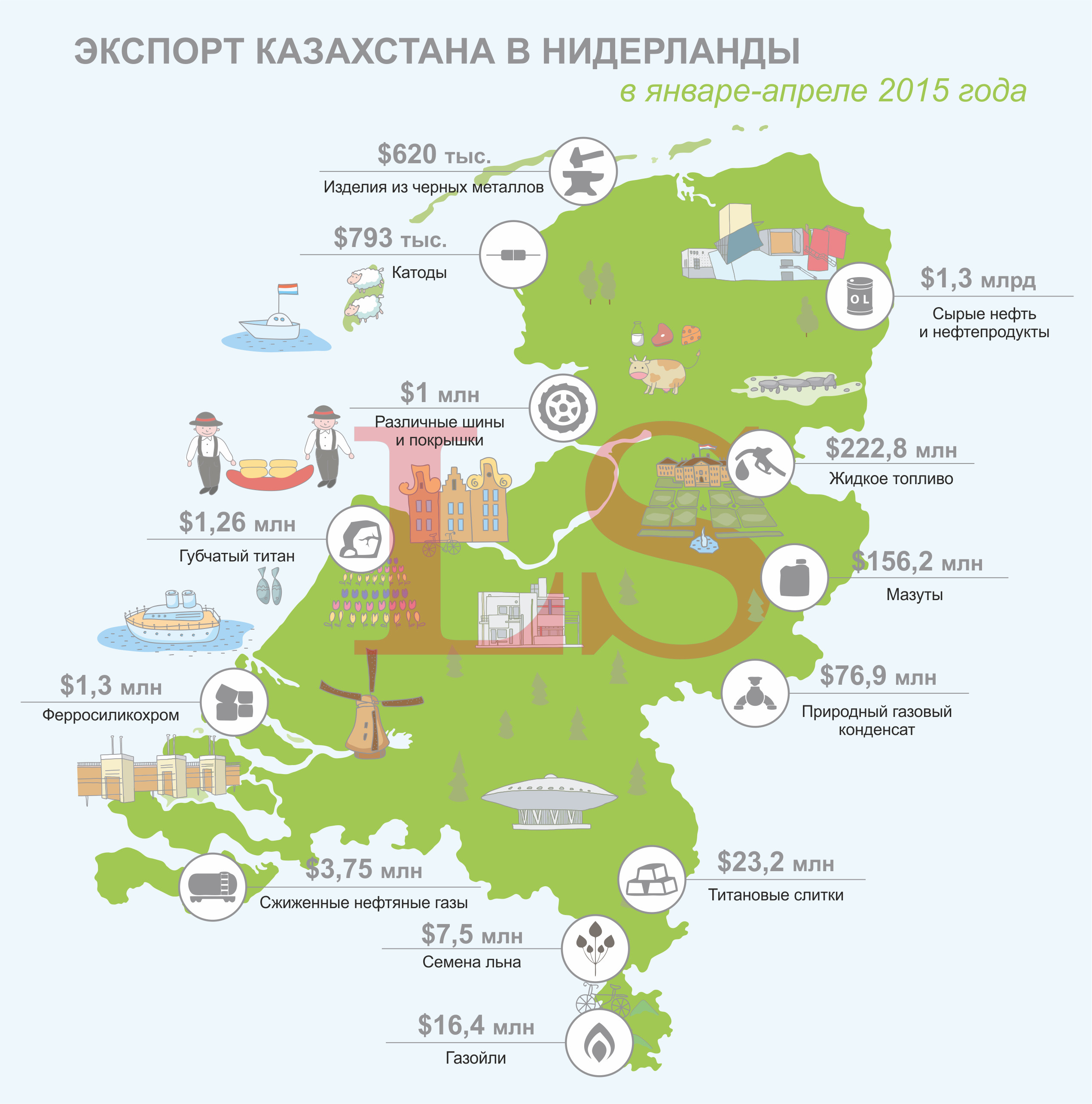 Кроме этого, Нидерланды закупают у Казахстана титановые слитки, ферросиликохром, губчатый титан и изделия из черных металлов. Помимо этого, Казахстан экспортирует в Нидерланды шины и покрышки для транспортных средств, используемых в строительстве и промышленности.