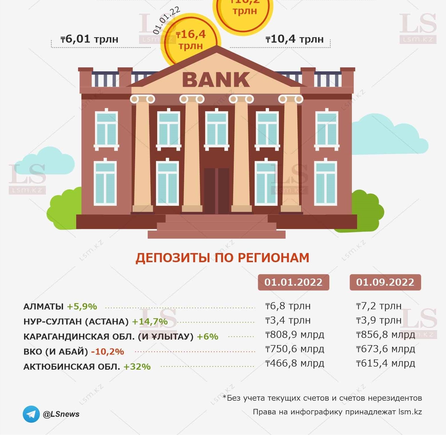 По данным Нацбанка, если на 1 января текущего года на вкладах (физлиц и юрлиц) находилось более 16,4 трлн тенге, то уже на 1 сентября сумма увеличилась до 17,8 трлн тенге. Рост с начала этого года – на 1,4 трлн тенге, или 8,8%.