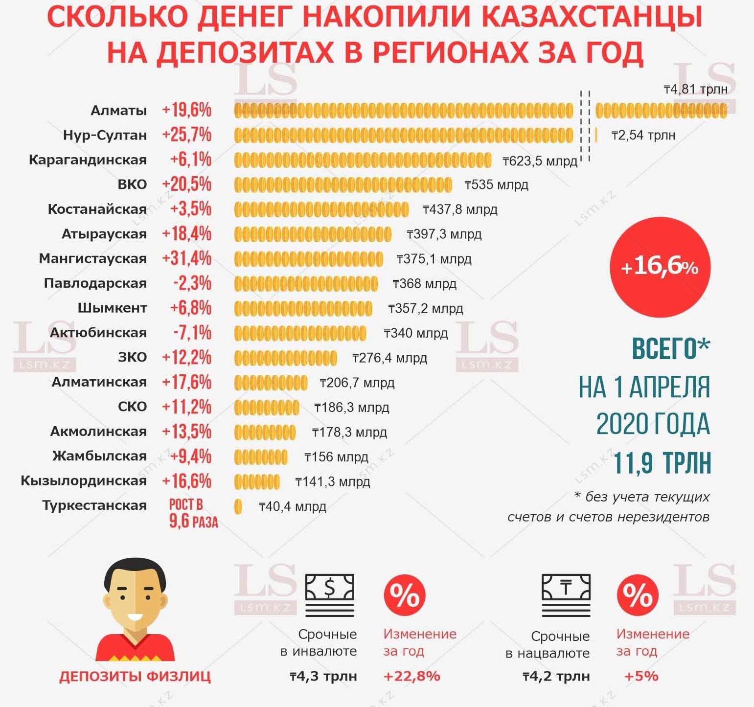 Также положительная динамика наблюдалась в Мангистауской области, где на депозитах накопилось более 375 млрд тенге (+31,4% за год), в Нур-Султане – 2,5 трлн тенге (+25,7%) и в ВКО – 535 млрд тенге (+20,5%).