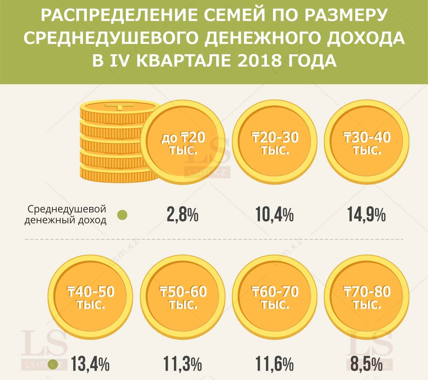 В 2,8% семьях Казахстана доход на одного члена составил менее 20 тыс. тенге в IV квартале 2018 года, передает LS.