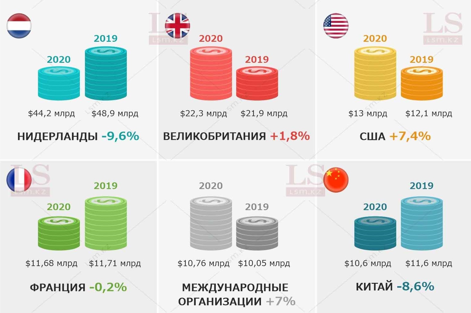 За этот период Казахстан значительно уменьшил обязательства перед Нидерландами – на $4,7 млрд. А также был сокращен долг перед Китаем на $1 млрд, Гонконгом на $1,2 млрд и Германией на $800 млн.