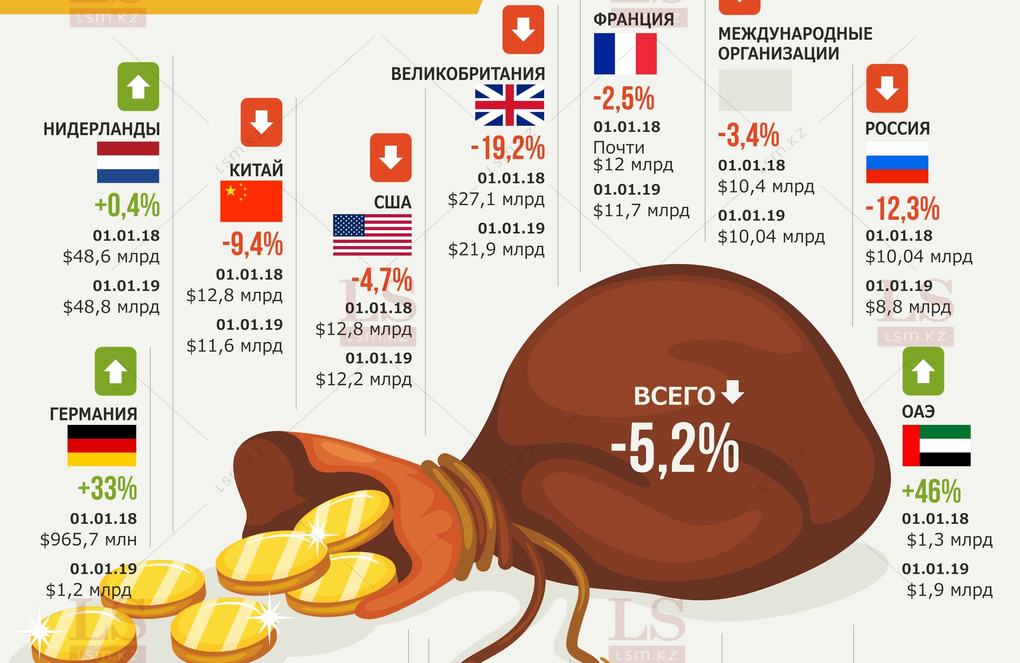 Внешний долг сократился за год на 5,2%. LS подготовил инфографику о том, каким странам Казахстан должен меньше всего.