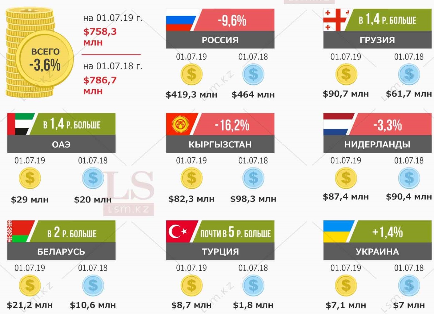 Согласно данным Национального банка, на 1 июля этого года наибольшая задолженность приходится на резидентов России – $419,3 млн (-9,6% за год), Грузии – $90,7 млн (+47%) и Нидерландов – $87,4 млн (-3,3%).