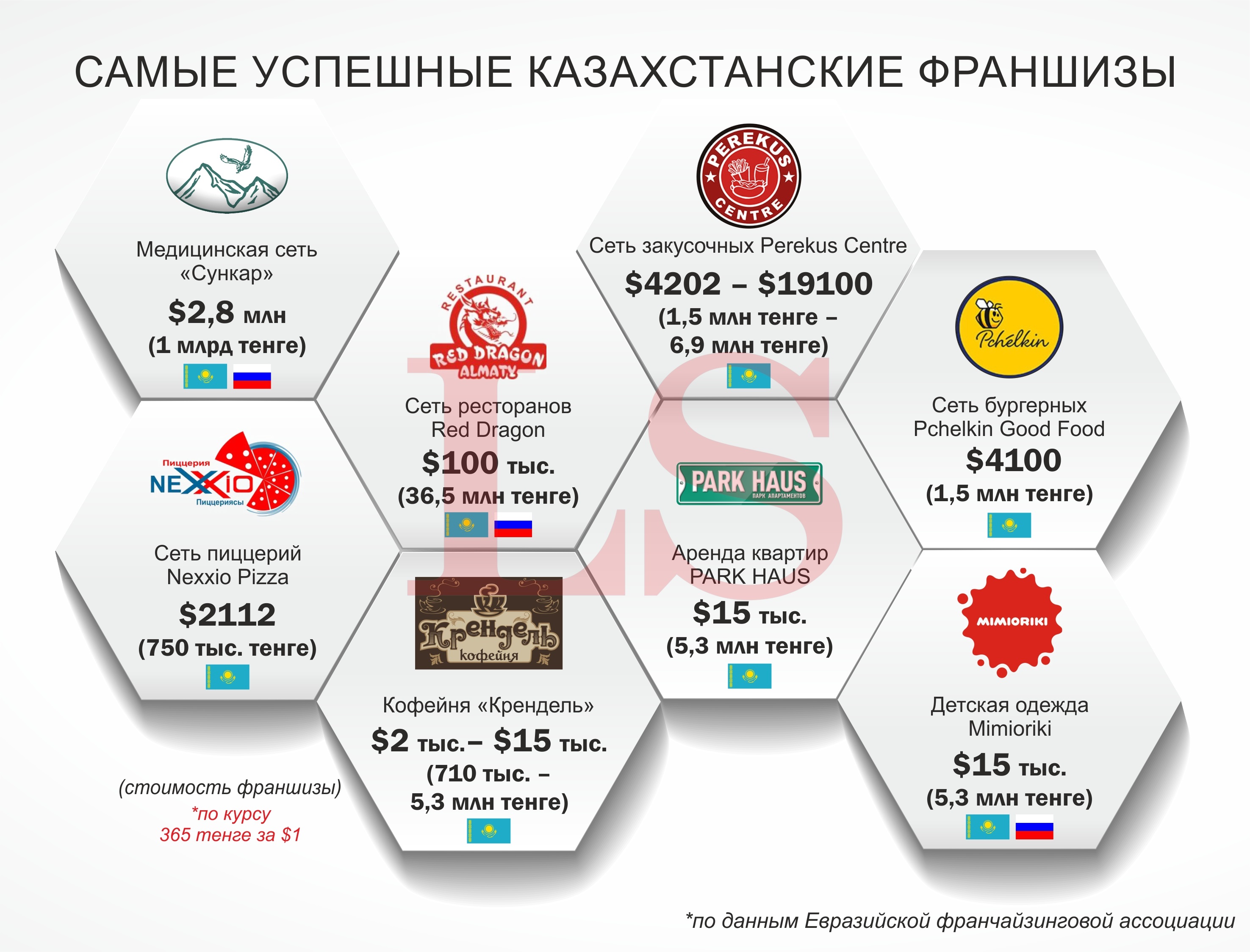 Он отметил, что на данный момент доля местных компаний составляет 20% и может вырасти до 25% в текущем году. При этом средняя казахстанская франшиза стоит от $10 тыс. до $20 тыс. В целом львиную долю франчайзига в Казахстане составляют российские компании. Предприятия из США и Европы уступают местным игрокам.