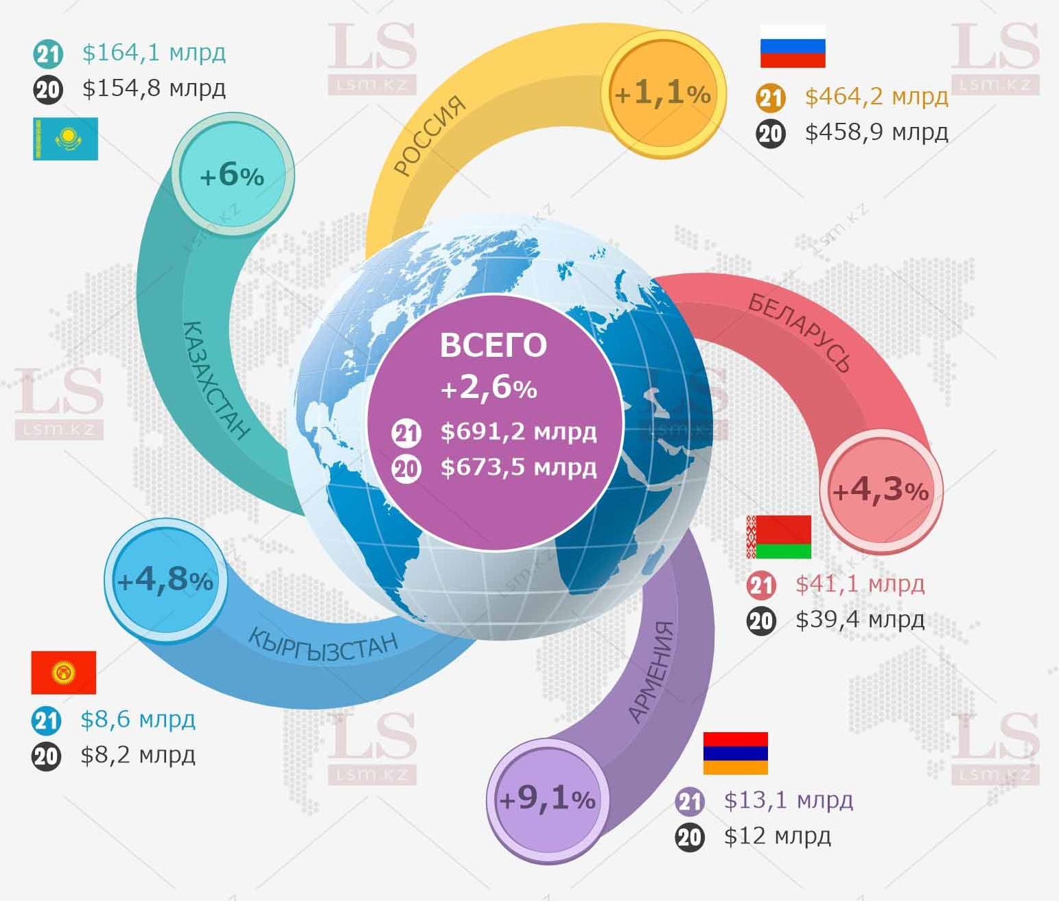 По данным ЕЭК, на 1 апреля 2021 года обязательства стран Союза составили свыше $691,2 млрд ($673,5 млрд на 01.04.2020). Рост за год превысил $17,7 млрд, или 2,6%.