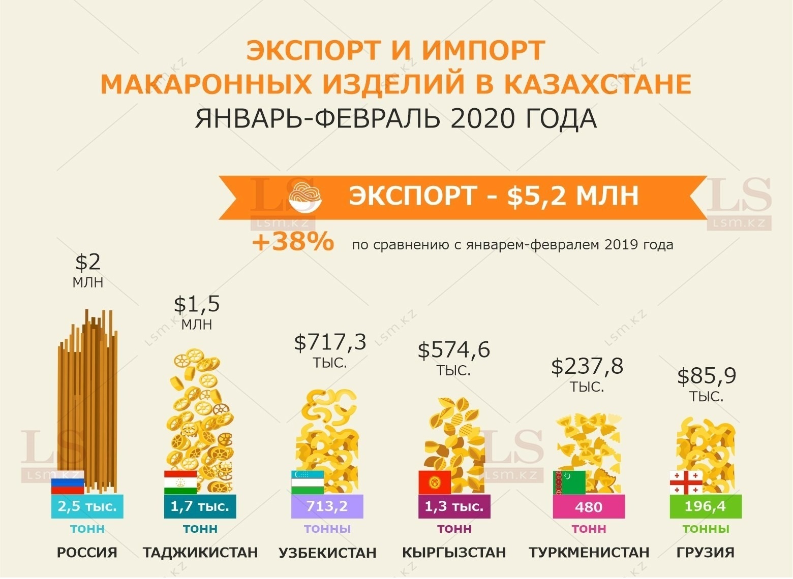 За два месяца 2020 года Казахстан экспортировал макаронные изделия на $5,2 млн. Объем увеличился на 38% по сравнению с аналогичным периодом 2019 года. Основными покупателями оказались Россия, Таджикистан, Узбекистан, Кыргызстан, Туркменистан и Грузия.