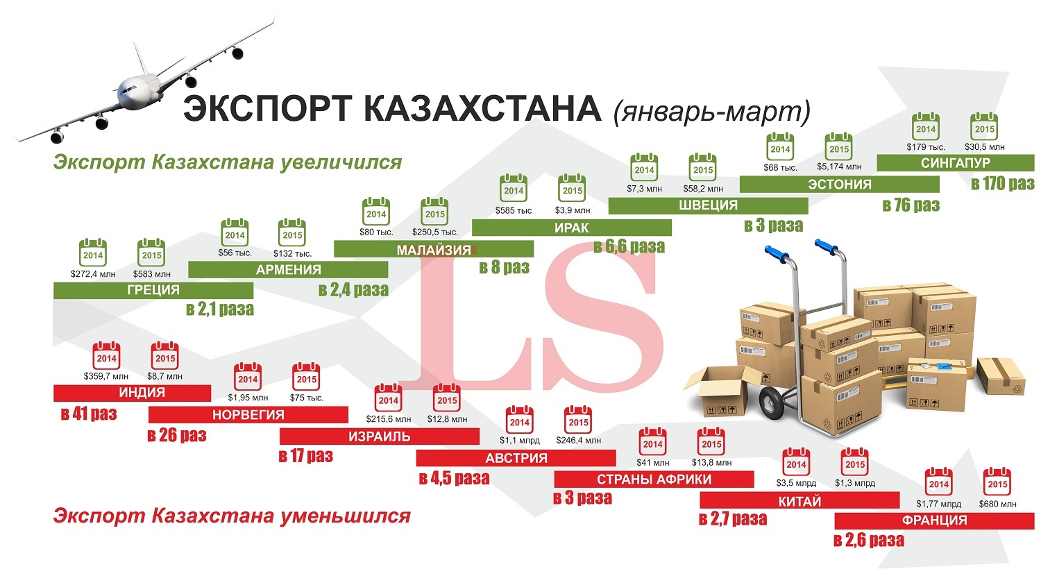 Так, по данным комитета по статистике Миннацэкономики, Казахстан уменьшил экспорт в Индию в январе-марте 2015 года по сравнению с январем-мартом 2014 года более чем в 40 раз, в Норвегию - в 26 раз, в Израиль - в 17 раз.