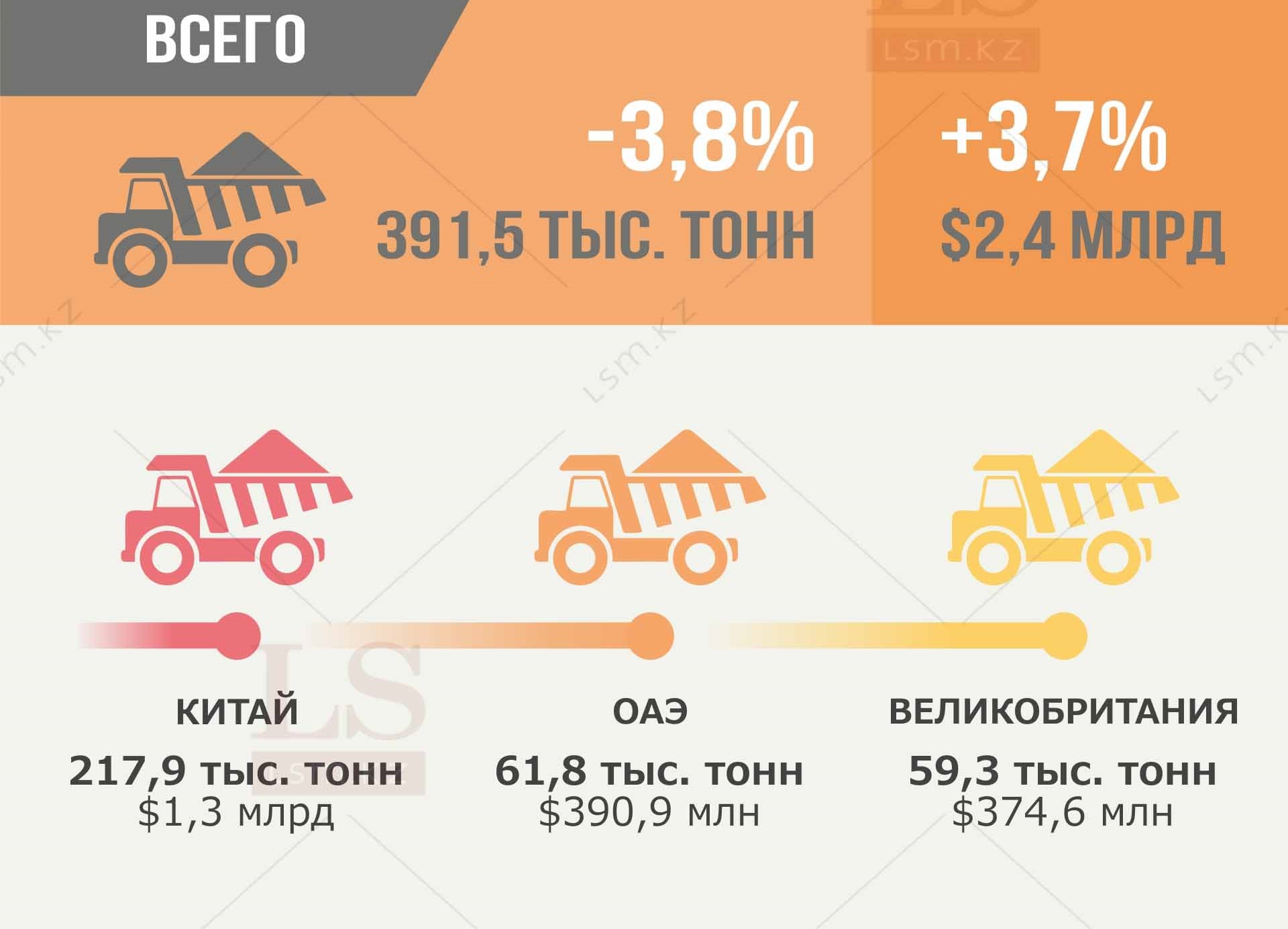 Наибольший объем был вывезен в Китай (217,9 тыс. тонн) и Объединенные Арабские Эмираты (61,8 тыс. тонн).