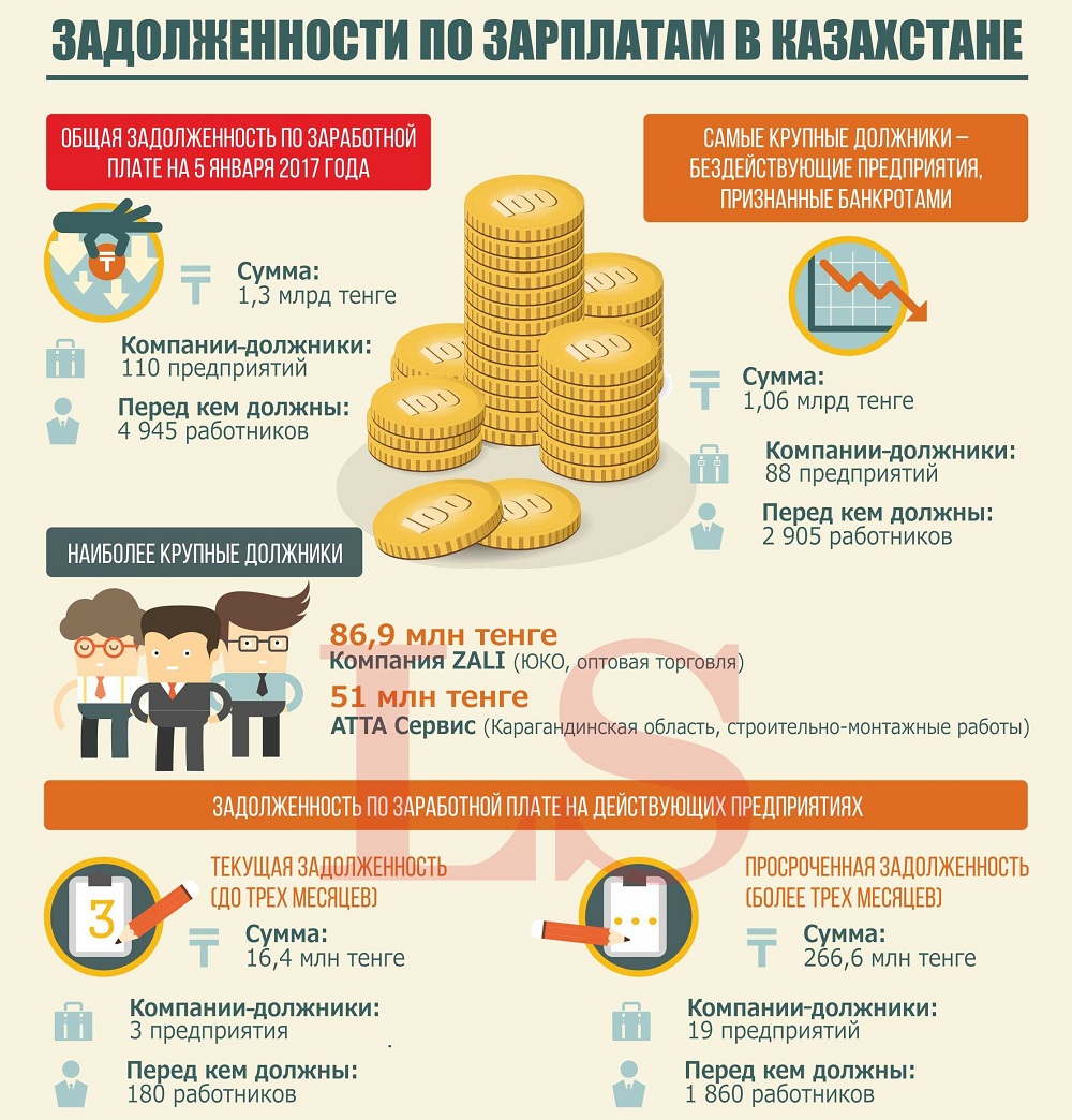 Более 100 предприятий Казахстана задолжали заработную плату 5 тыс. работникам на 1,3 млрд тенге. Такие данные предоставило LS министерство здравоохранения и социального развития.