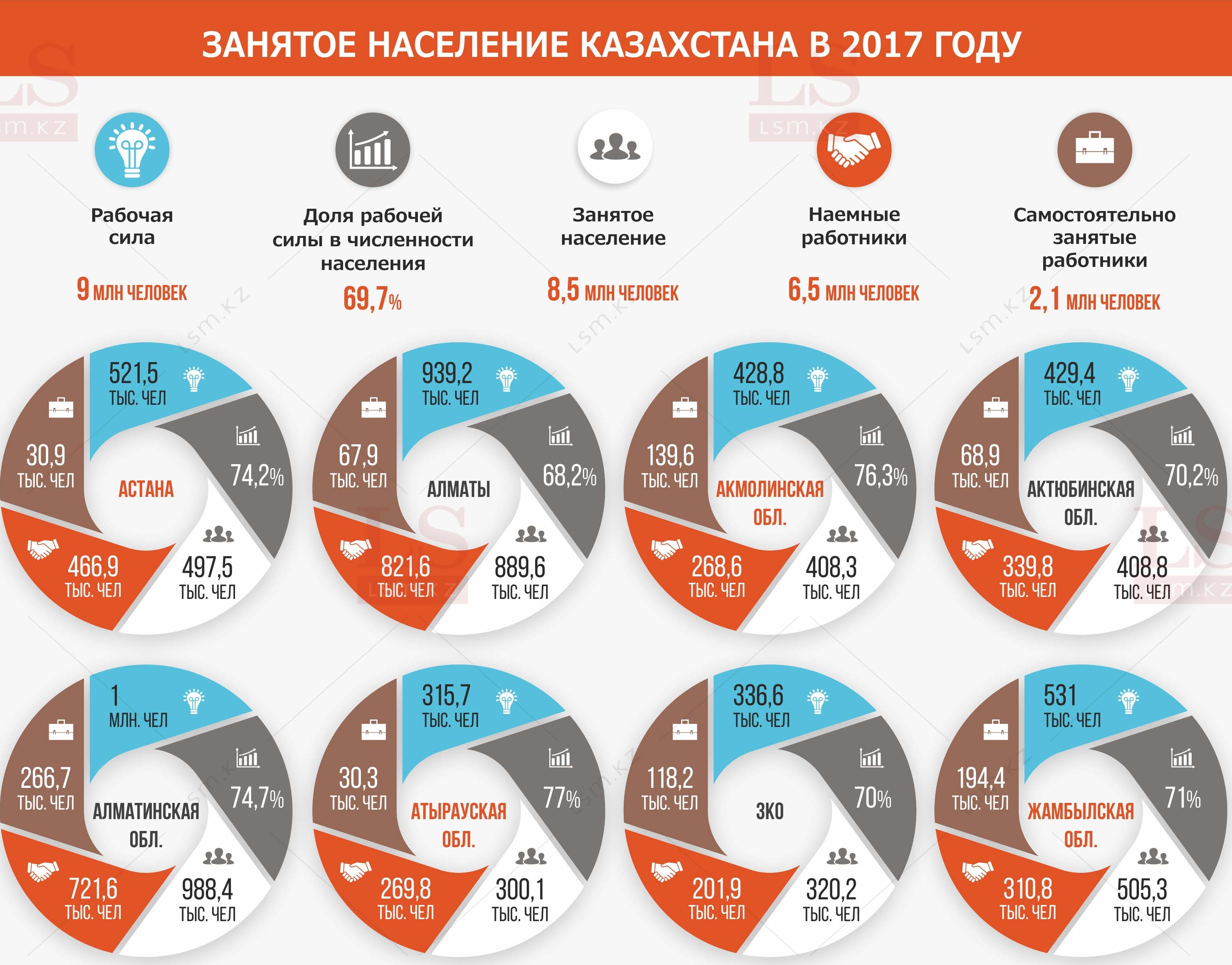 В 2017 году рабочая сила в Казахстане составила 9 млн человек. Это 69,7% от всего населения страны, передает LS.
