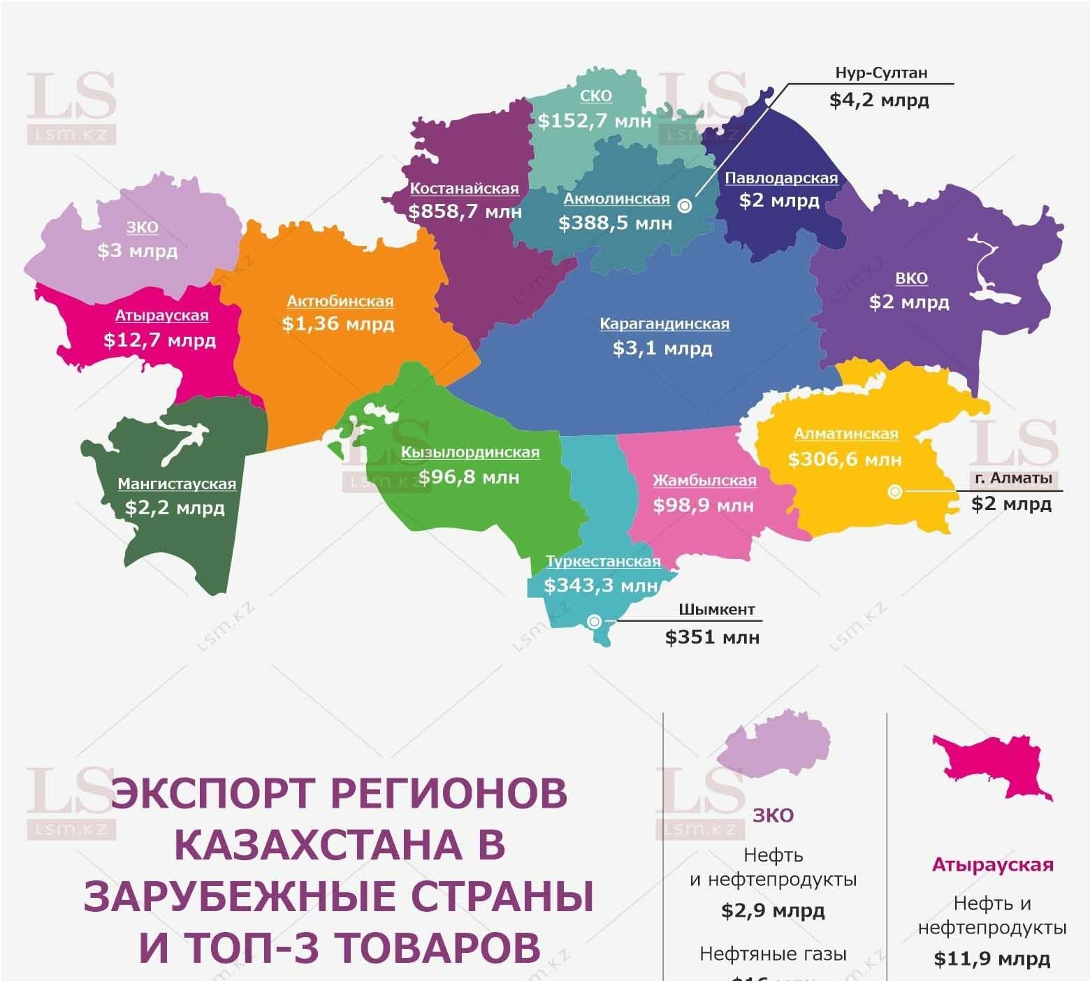 Каждый регион Казахстана по-своему богат. И свои ресурсы они поставляют не только на внутренний рынок, но и на зарубежные. LS показывает, какие товары экспортируют области и крупнейшие города страны.