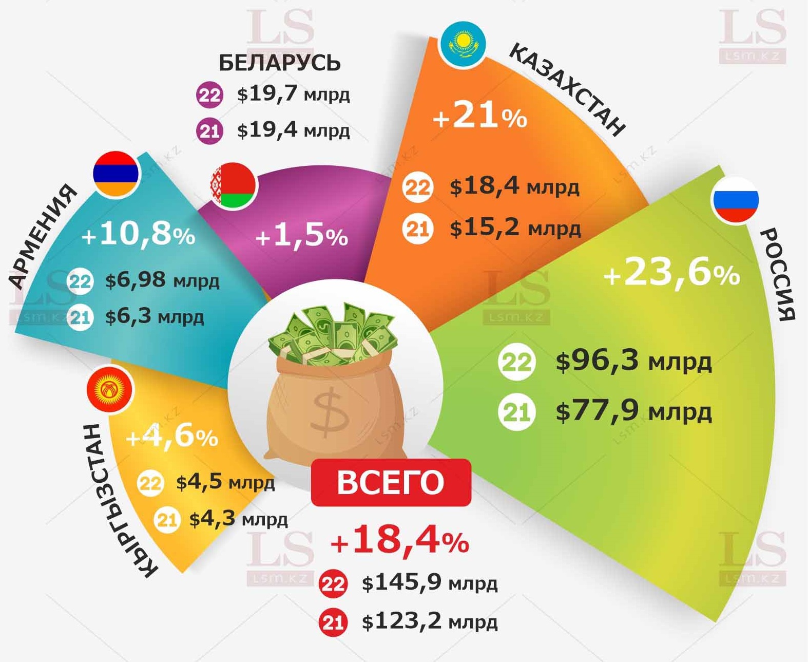 Согласно данным Евразийской экономической комиссии, на 1 января 2022 года совокупные обязательства стран Союза составляли $145,9 млрд. Тогда как на аналогичную дату 2021 года – $123,2 млрд. Рост за год на 18,4%, или $22,7 млрд.
