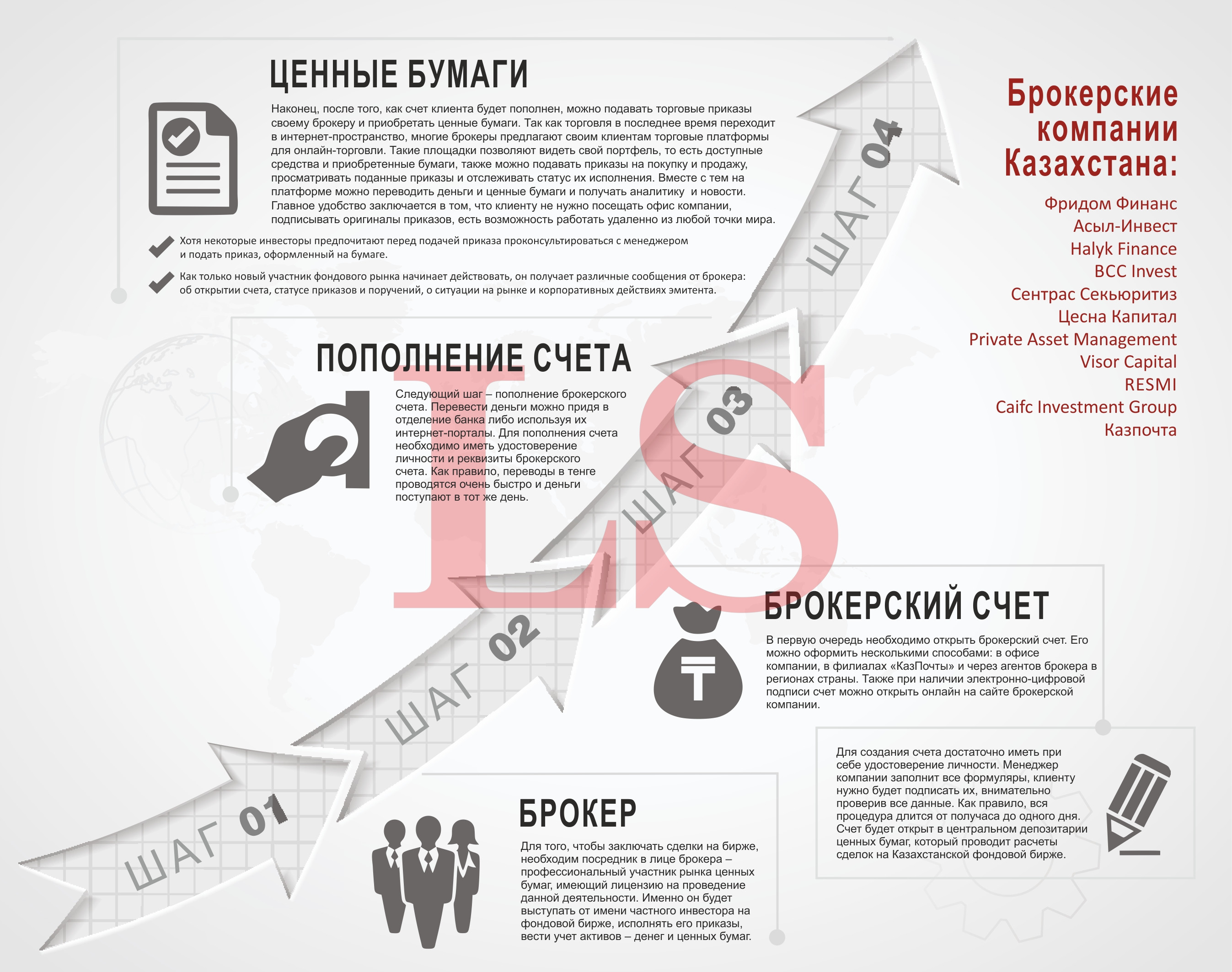 Ценные бумаги являются одним из эффективных, хоть и рисковых, финансовых инструментов. Для заключения и ведения данных сделок на бирже потребуется посредник в лице брокера, который от имени клиента будет покупать акции, вести учет активов – денег и ценных бумаг. В первую очередь, необходимо открыть брокерский счет. Его можно оформить несколькими способами: в офисе компании, в филиалах "Казпочты" и через агентов брокера в регионах страны.