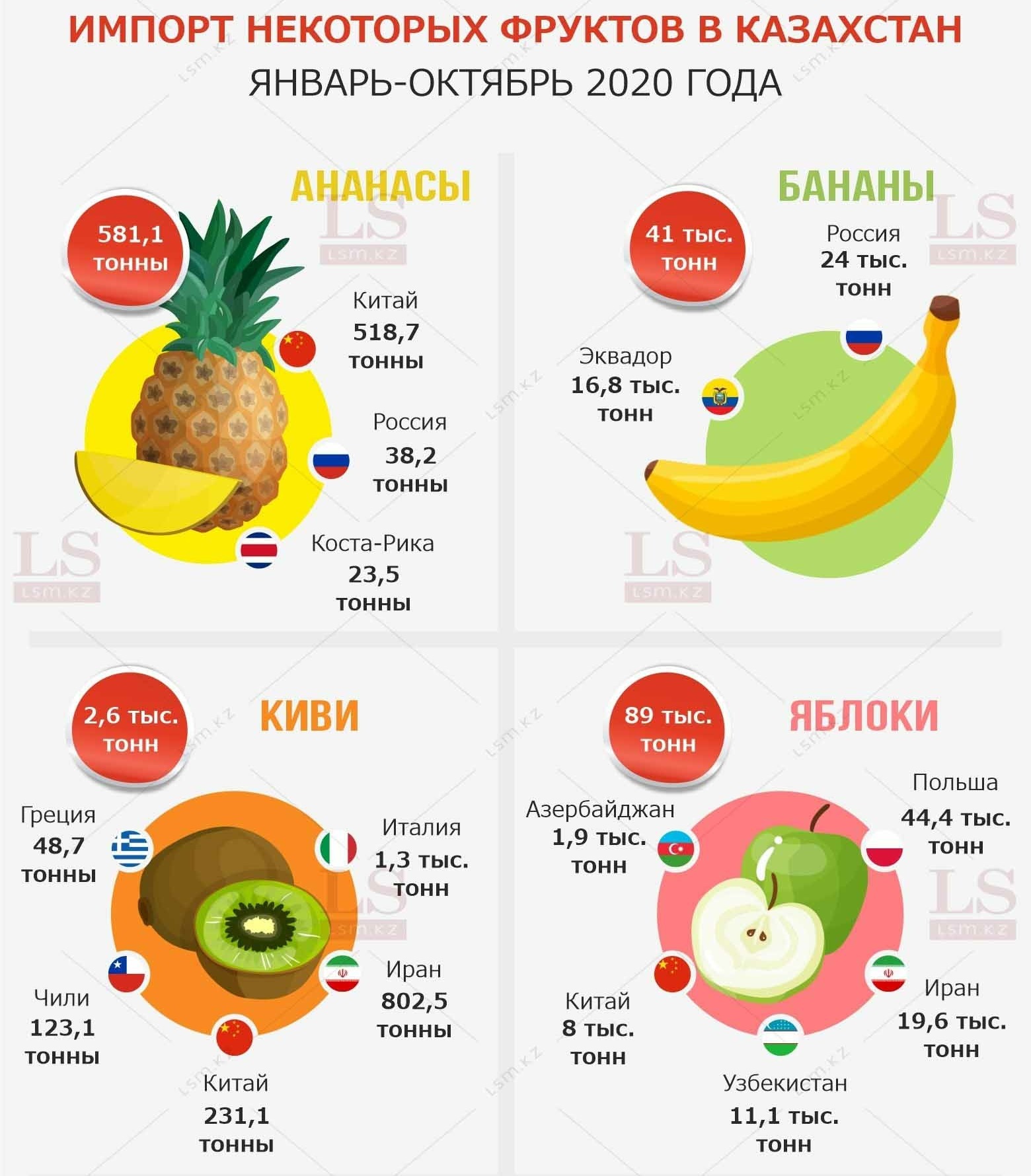 Преимущественно фрукты импортируют из стран ближнего зарубежья – Китая, России, Узбекистан, Кыргызстана и т.д. Также поставляются бананы из Эквадора, киви из Чили, яблоки из Польши, апельсины из ЮАР и другие.