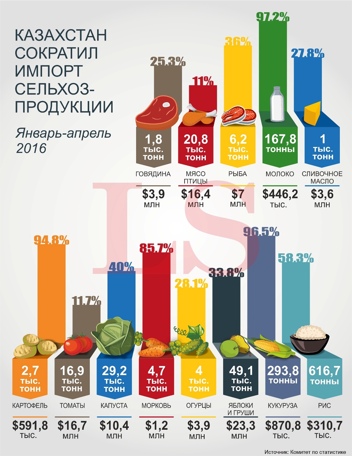 В январе-апреле 2016 года Казахстану удалось снизить импорт некоторых товаров агропромышленного комплекса, передает LS.