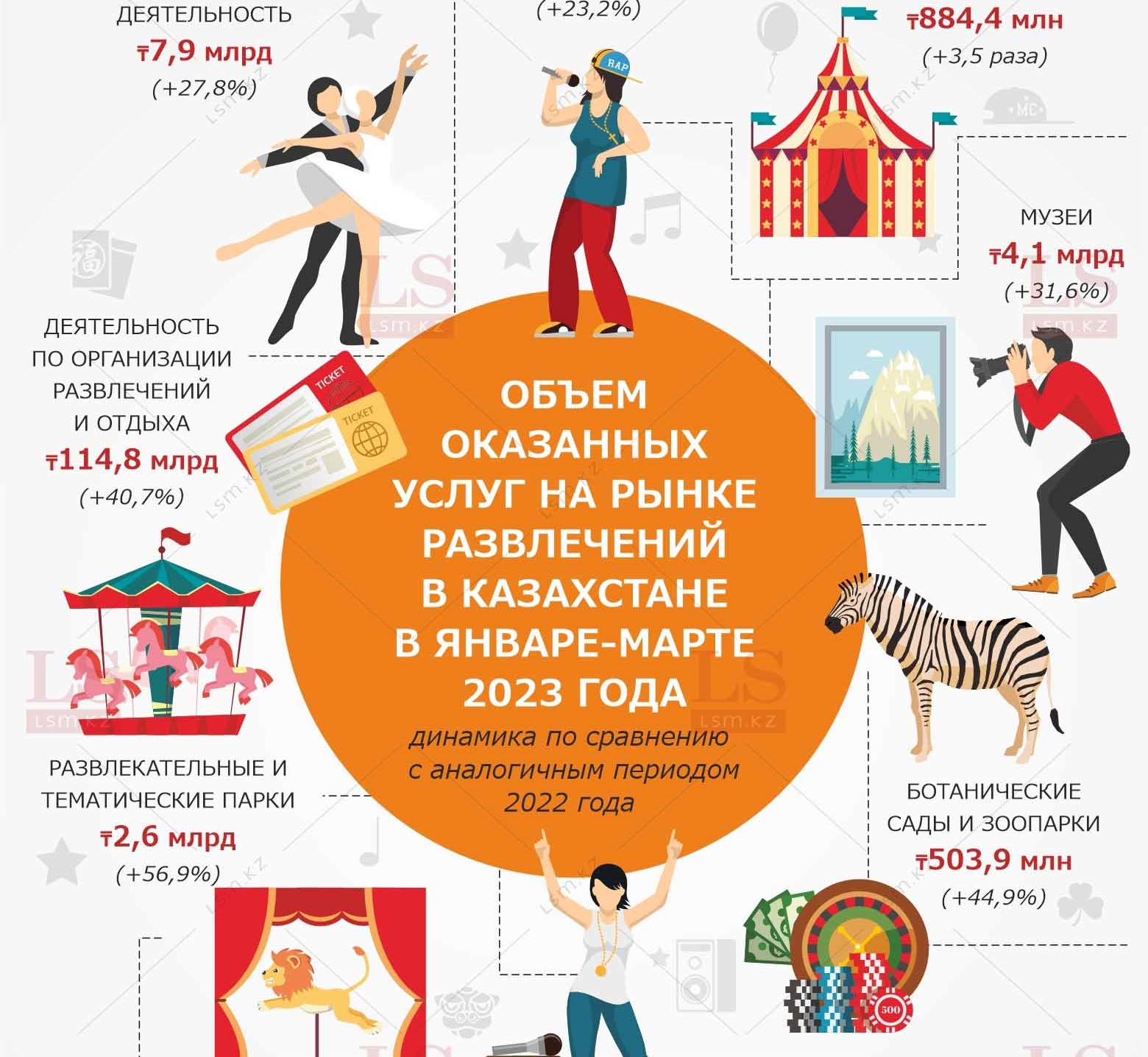 За I квартал 2023 года жители и гости страны оставили в цирках в 3,5 раза больше денег (884,4 млн тенге), чем за аналогичный период 2022 года. Востребованы были и танцевальные залы с дискотеками – рост в 23 раза (132 млн тенге). Такие данные опубликовало Бюро нацстатистики.
