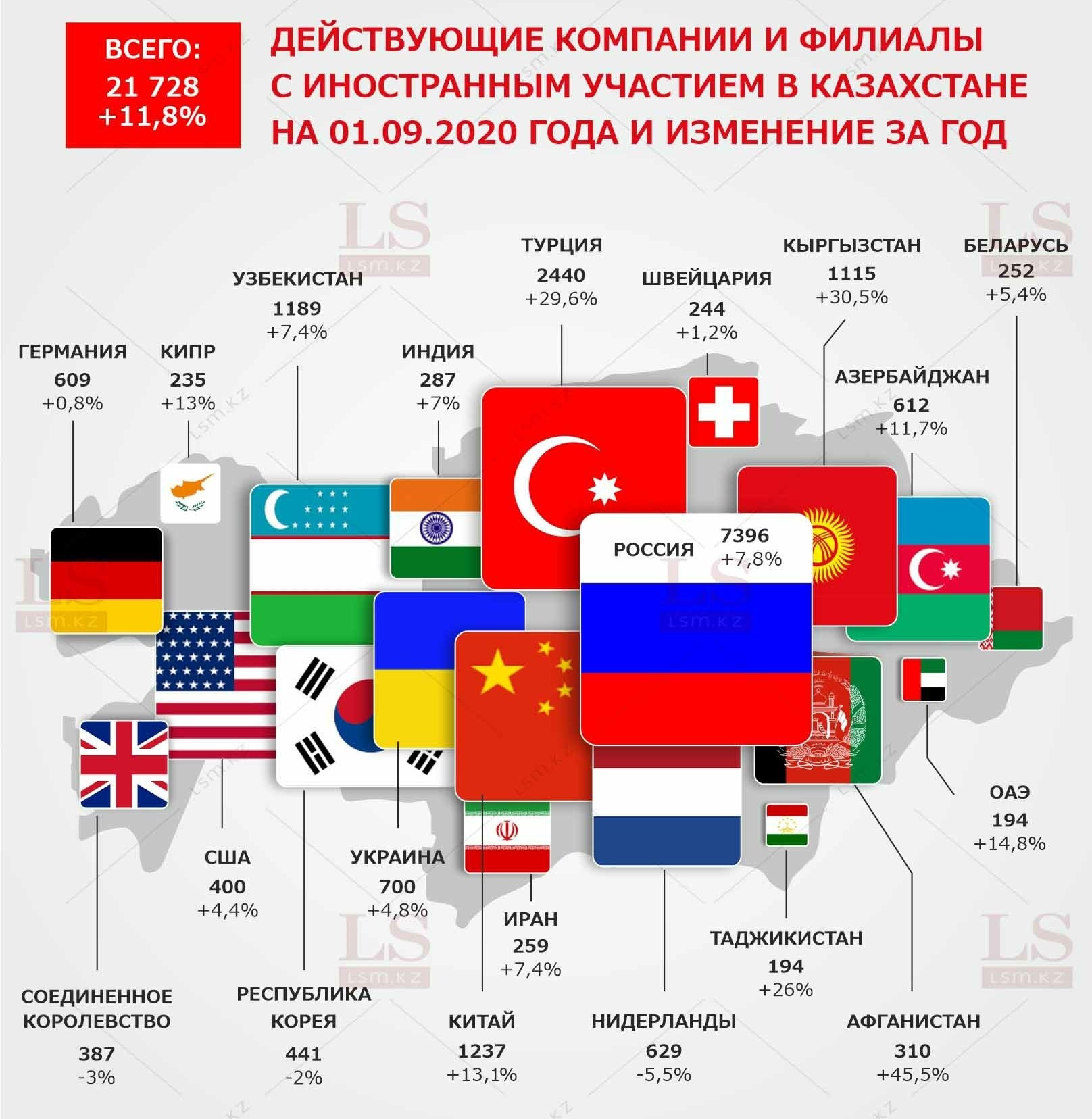 В Казахстане на 1 сентября 2020 года действующими являются более 21,7 тыс. иностранных компаний и филиалов зарубежных юрлиц. Данная цифра на 11,8% больше, чем годом ранее.