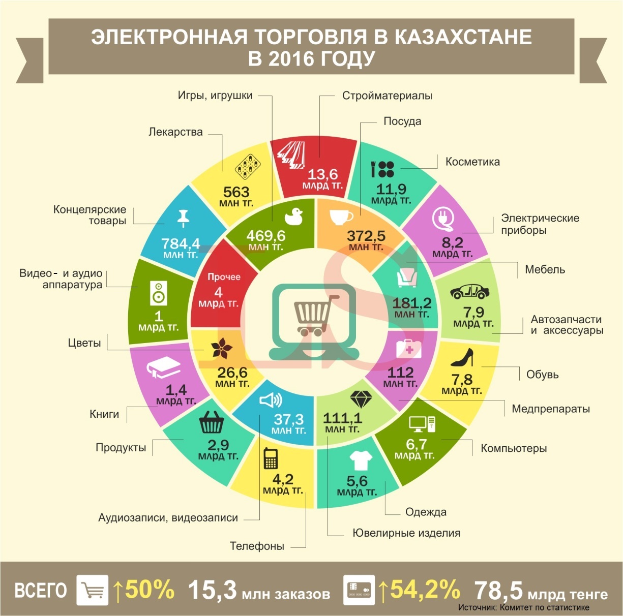 Наибольший объем интернет-торговли пришелся на стройматериалы (13,6 млрд тенге), косметику (11,9 млрд тенге) и электрические приборы (8,2 млрд тенге).