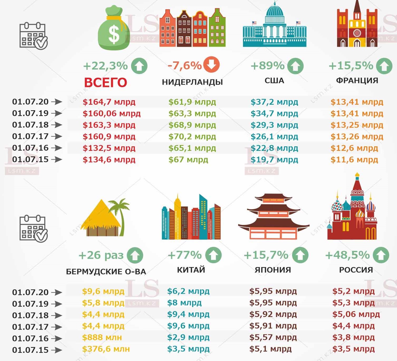 Согласно данным Национального банка на 1 июля 2020 года в Казахстан поступило $164,7 млрд. А вот на аналогичную дату 2015 года эта сумма составляла $134,6 млрд. Таким образом, за пять лет объем инвестиций в страну вырос на $30 млрд, или 22,3%.
