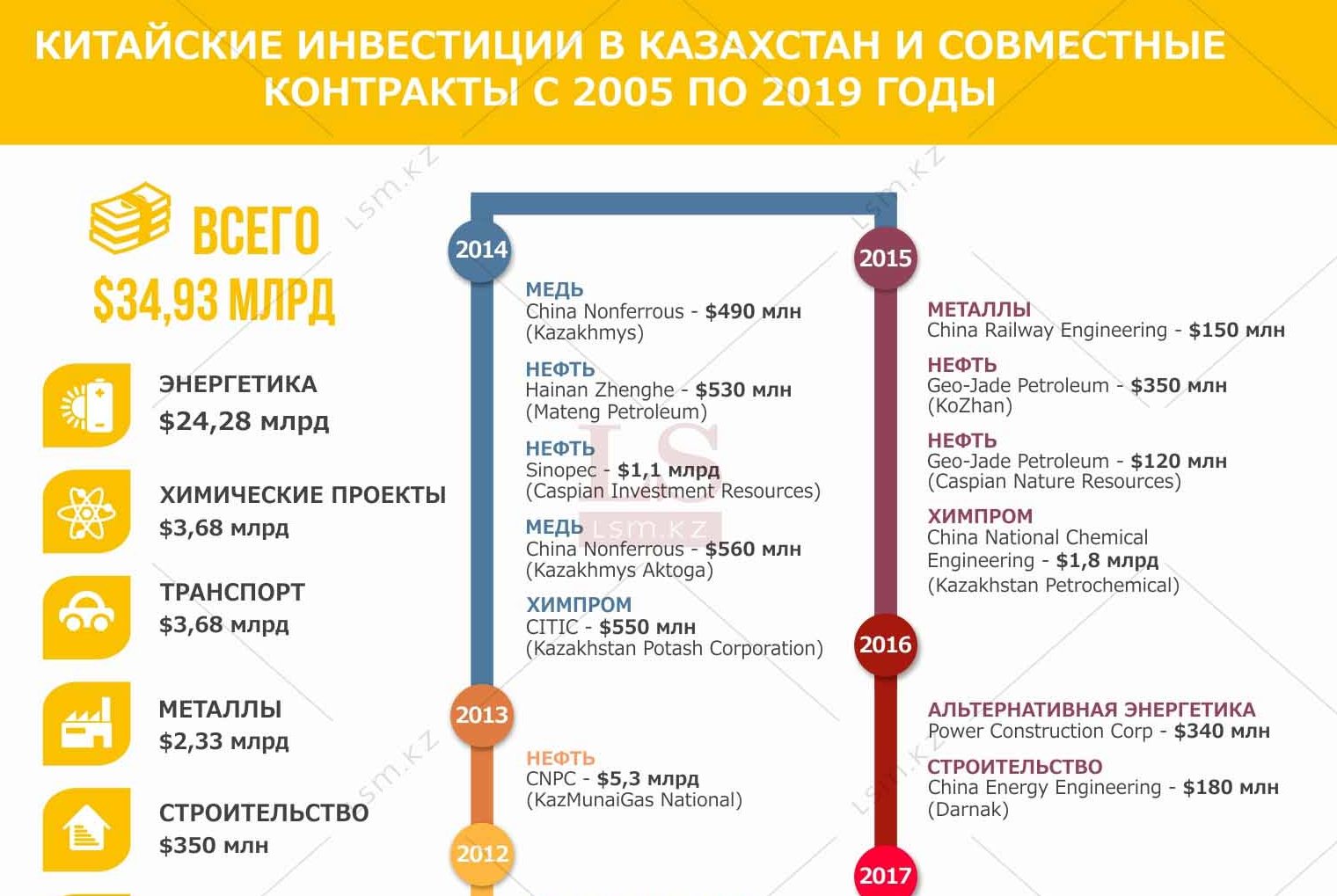 С 2005 по 2019 годы инвестиции Китая в казахстанские компании и сумма совместных проектов достигла почти $35 млрд, передает LS.