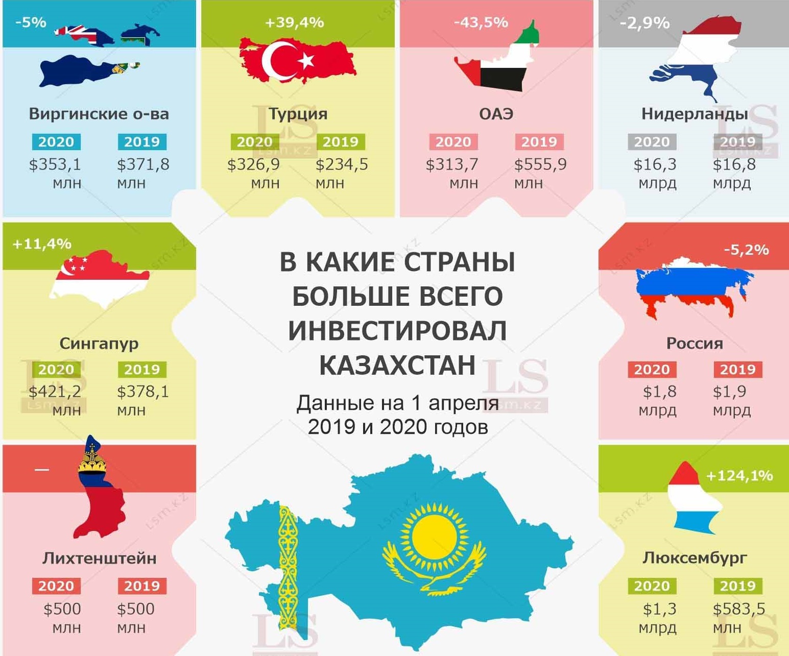 Больше всего Казахстан по-прежнему инвестировал в Нидерланды – $16,3 млрд (-2,9% за год). На втором месте расположилась Россия, которая получила $1,8 млрд (-5,2%). Замыкает тройку лидеров Люксембург. В эту страну инвестиции из Казахстана выросли за год на 124% до $1,3 млрд.