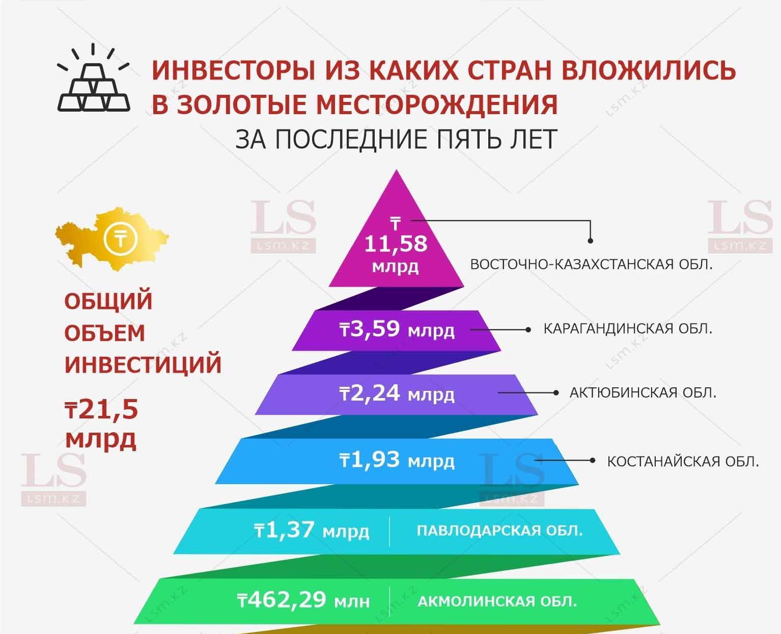 Так, больше всего денег было вложено в золотые месторождения Восточно-Казахстанской области – 11,58 млрд тенге. В Карагандинский регион зарубежные компании инвестировали 3,59 млрд тенге, в Актюбинскую область – 2,24 млрд тенге.