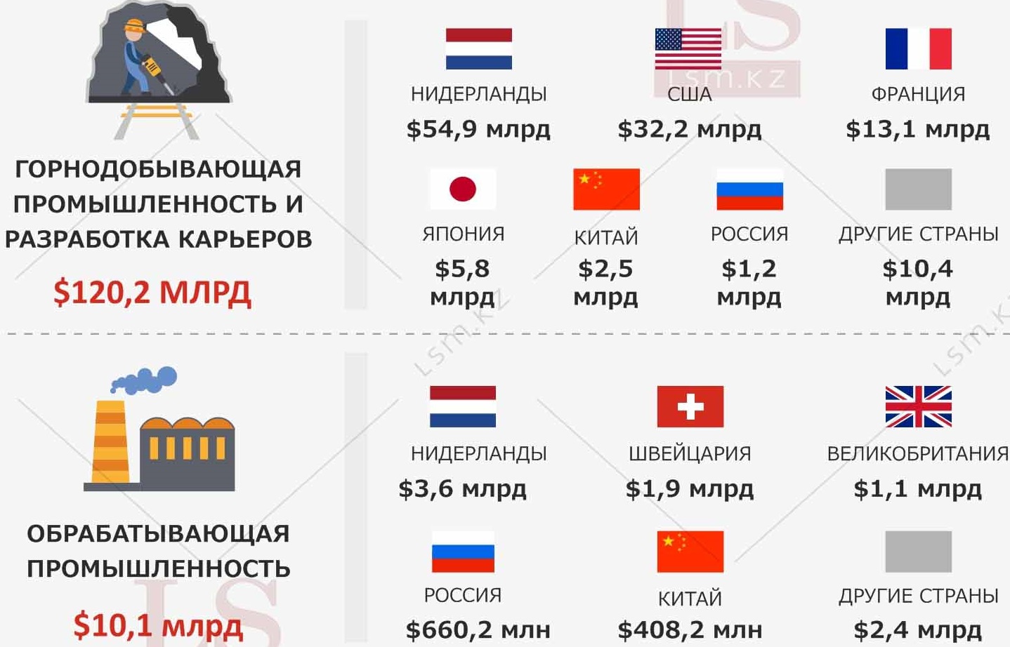 По данным Национального банка, за I квартал 2019 года основную часть средств традиционно инвестировали в горнодобывающую промышленность и разработку карьеров - более $120 млрд. Из них из Нидерландов было получено почти $55 млрд, из США – $32,2 млрд. Китай вложил в указанную отрасль $2,5 млрд, а Россия – $1,2 млрд.
