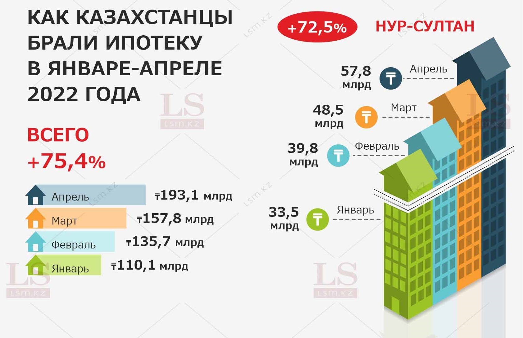 Между тем традиционно лидером по объему выдачи займов на жилье является Нур-Султан, где в апреле было оформлено ипотечных кредитов на 57,8 млрд тенге (+72,5% в сравнении с январем 2022 года). Далее следуют Алматы – 45 млрд тенге (+106,4%), Карагандинская область – свыше 13 млрд тенге (+94,2%), Шымкент – более 7 млрд тенге (+16%) – и ВКО – 9,4 млрд тенге (+80,7%).