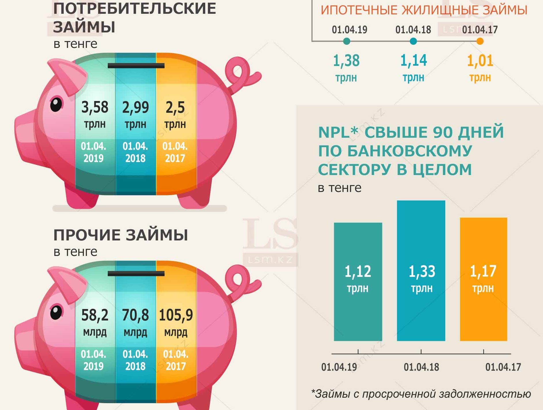 Согласно данным Национального банка, на 1 апреля 2019 года фининституты прокредитовали население на 5,1 трлн тенге. Для сравнения, на 1 апреля 2017 года эта сумма составляла 3,76 трлн тенге (+37,8%)