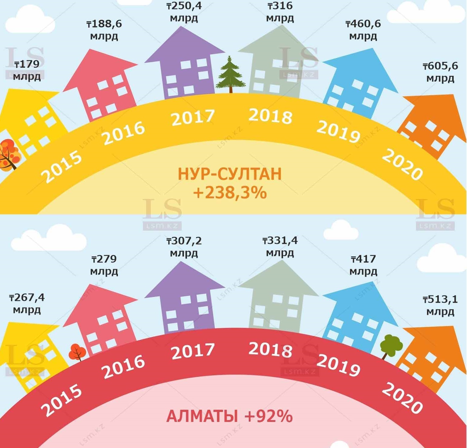 Лидером по объему выданных жилищных займов с 2019 года является Нур-Султан. В столице на ипотеку заняли 605,6 млрд млрд тенге, что на в 3,4 раза больше, чем в 2015 году.