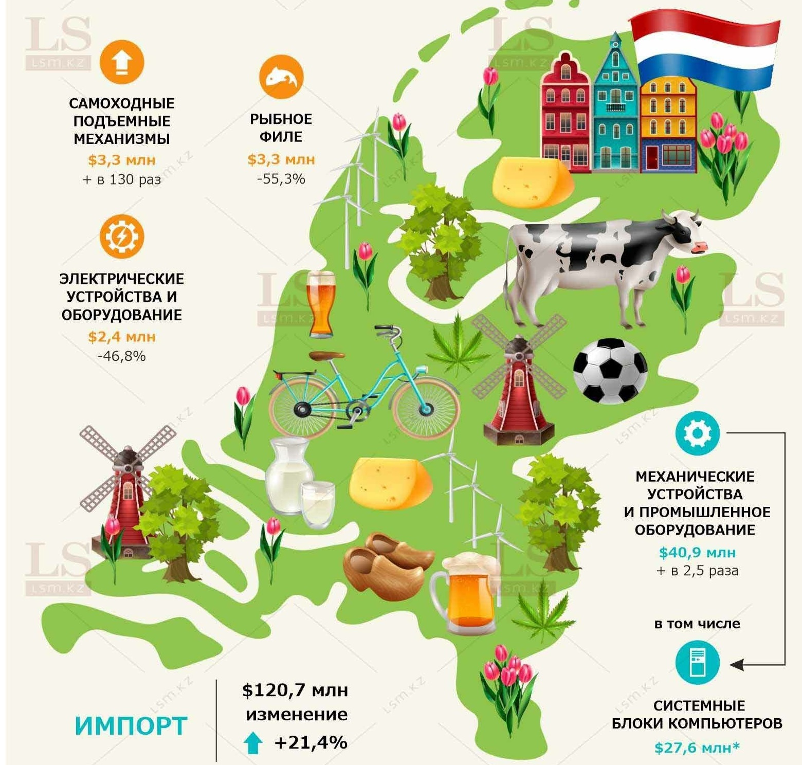 В то же время импорт за отчетный период увеличился на 21,4% до $120,7 млн. Наибольшую долю занимают механические устройства и промышленное оборудование, поставки которых выросли в 2,5 раза. Помимо этого, Казахстан закупил у Нидерландов лекарства, тракторы, цветы, медицинское оборудование, грузовой транспорт, красящие вещества, нефтепродукты и другие товары.