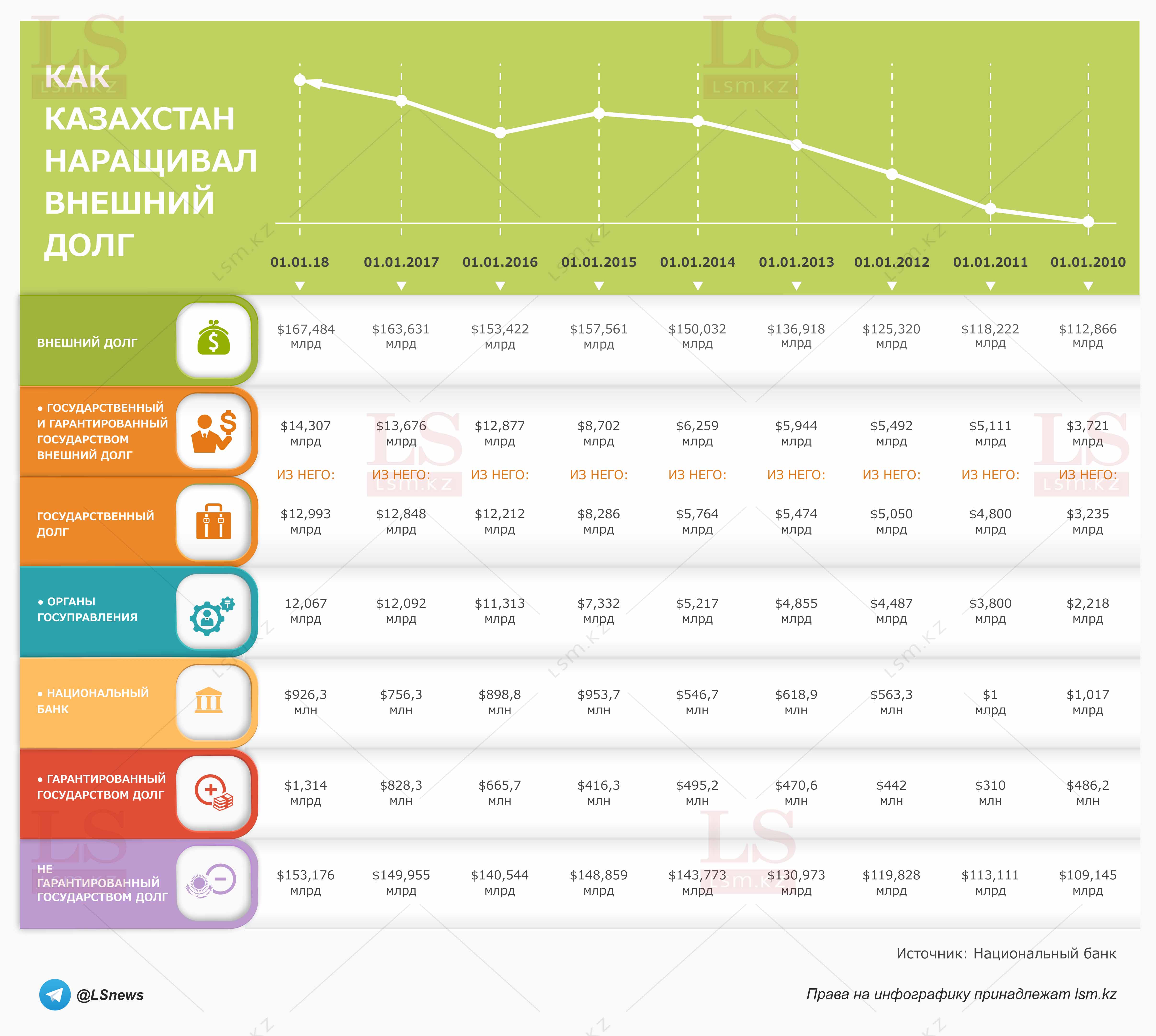 Внешний долг Казахстана в последние несколько лет увеличивается. На начало 2018 года он составил $167,5 млрд, передает LS.